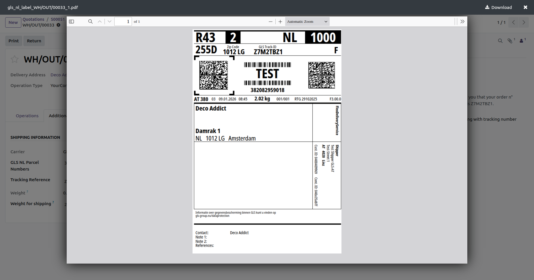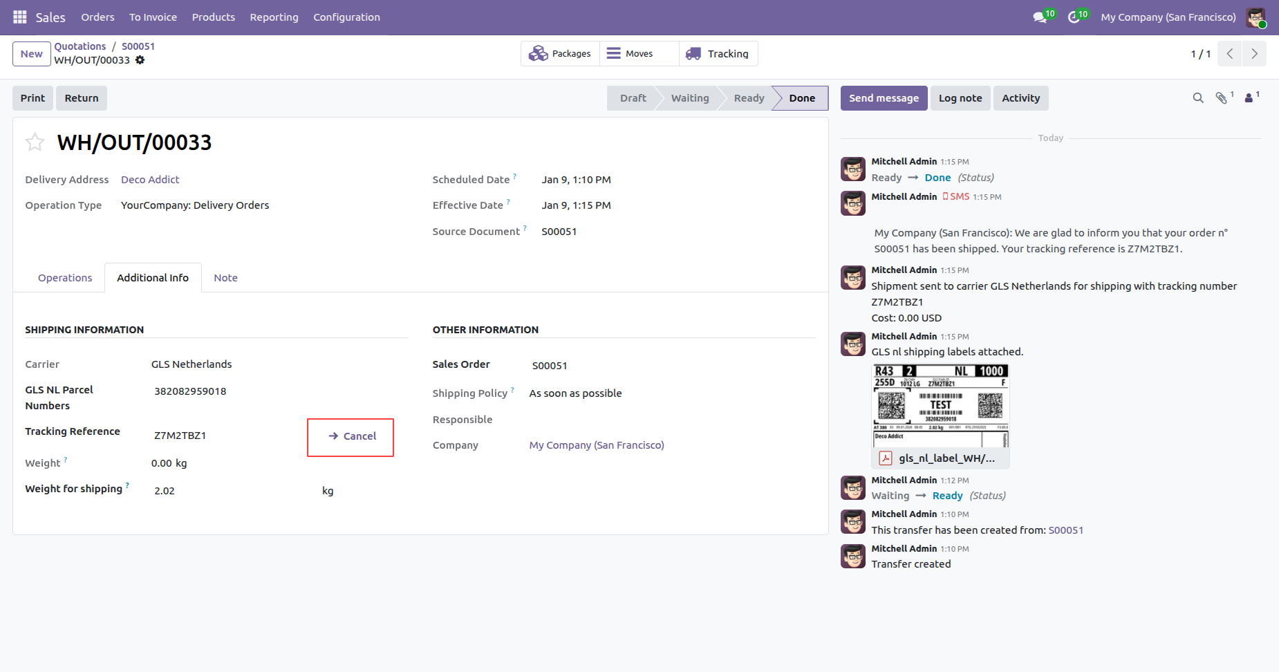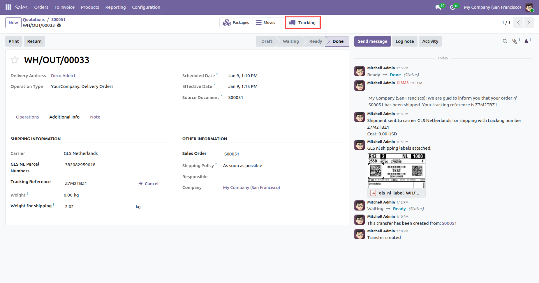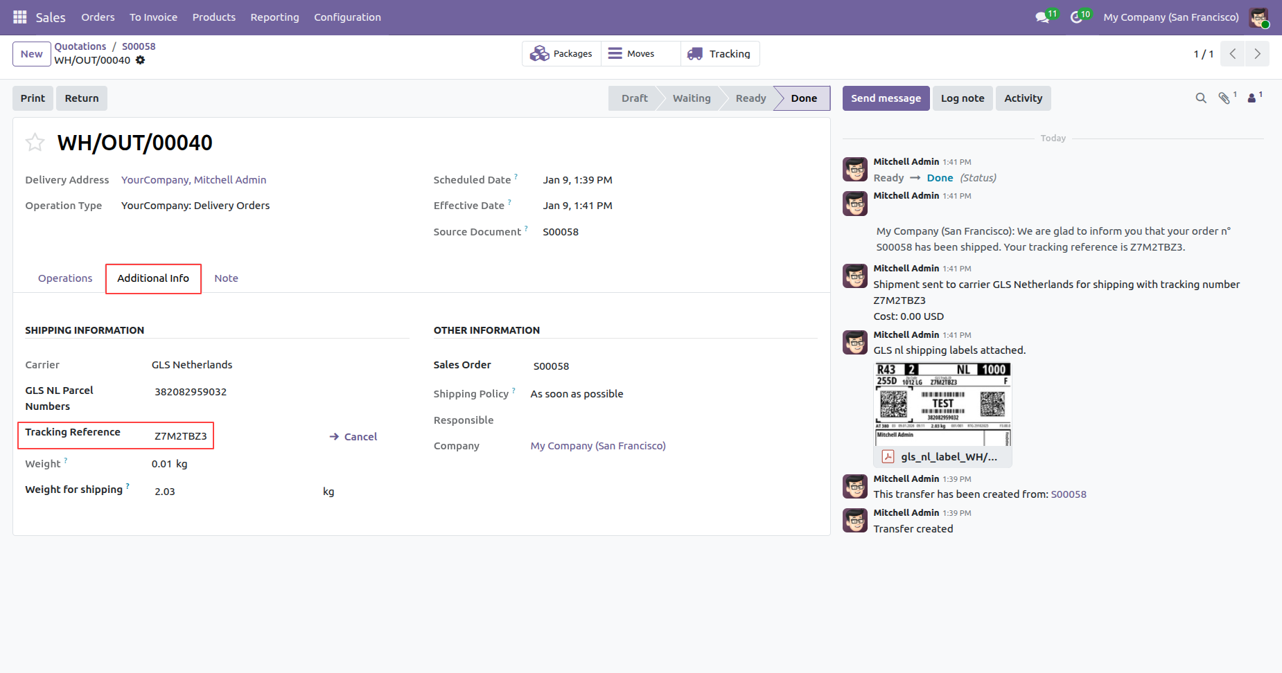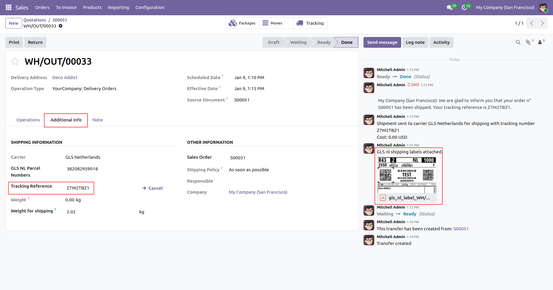 The delivery order with details in the backend. It displays the Shipping Information under the Additional Info tab after generating the label. In the log note, it shows that the shipping label was successfully generated, along with a downloadable PDF link.