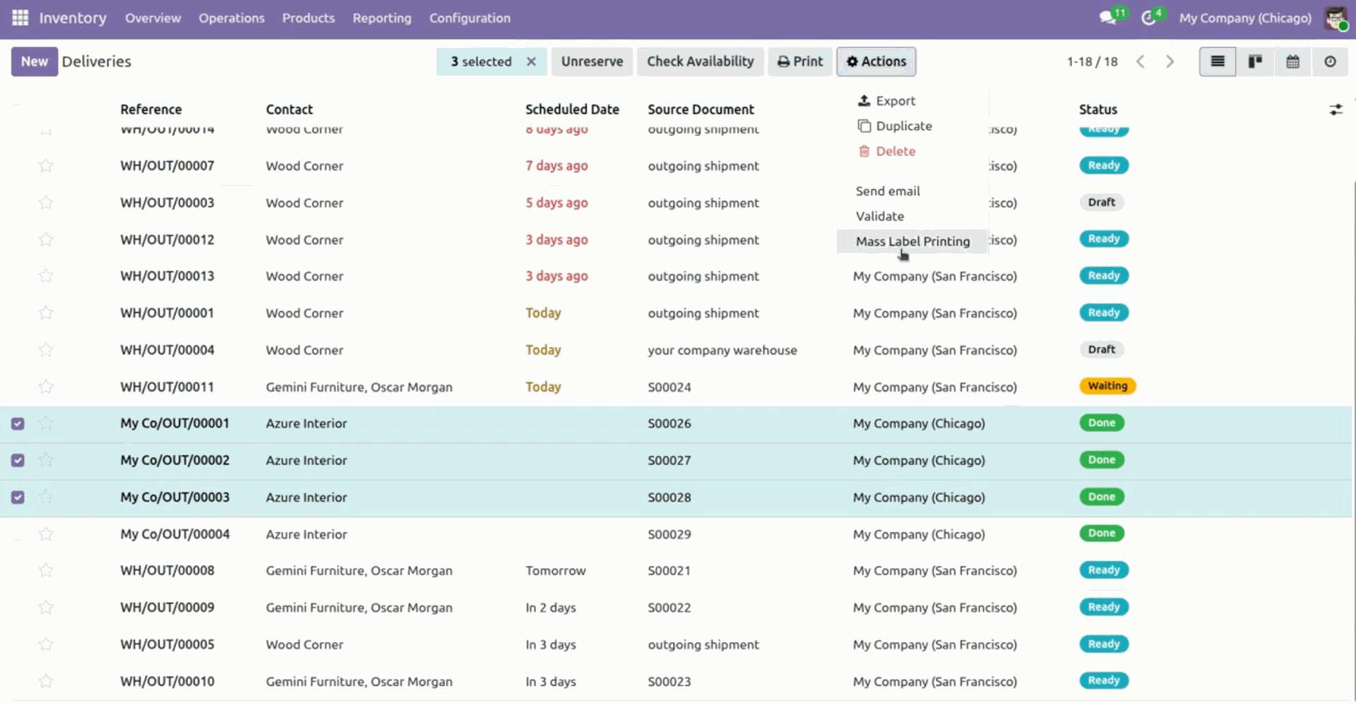 Select deliveries and click Action -> Mass Label Printing.