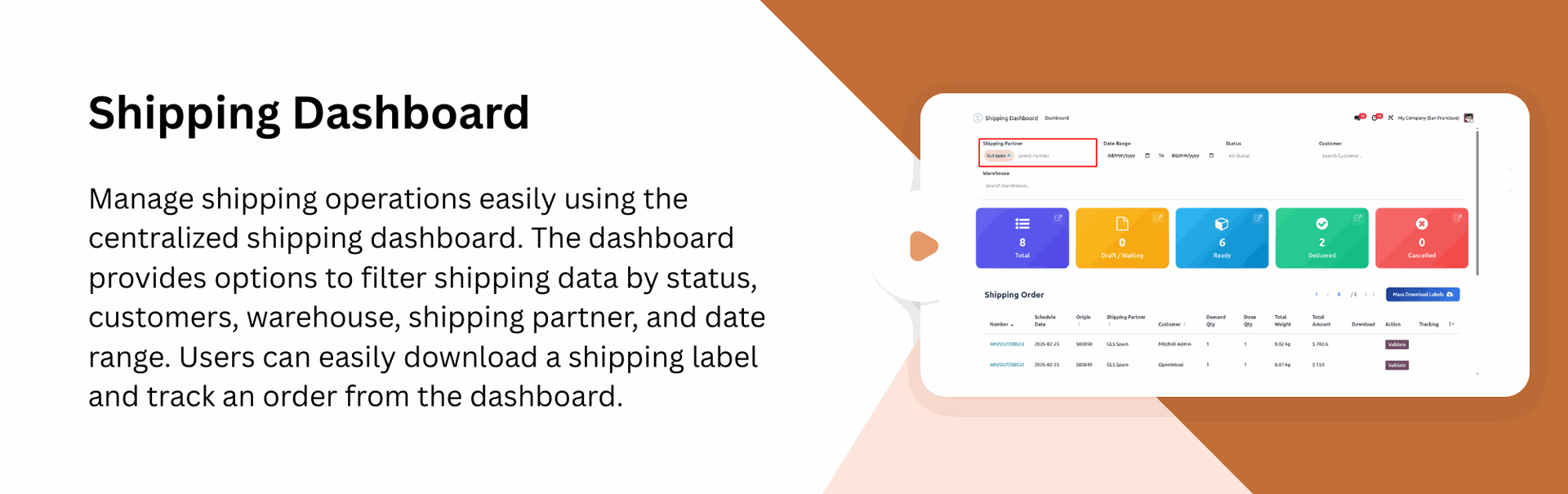 Track shipments in real-time within Odoo, admins can monitor deliveries from the backend, while customers can track from portal.