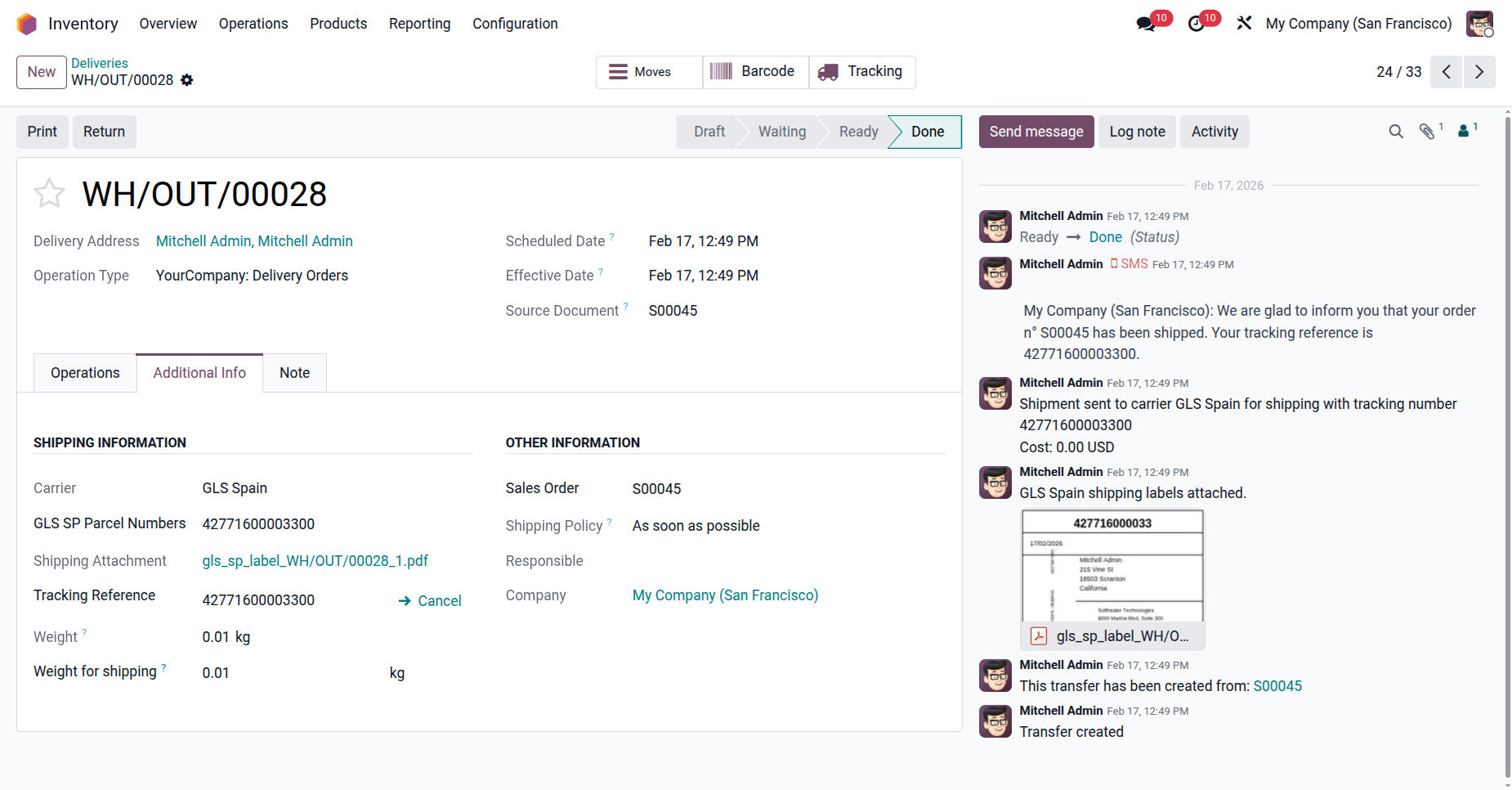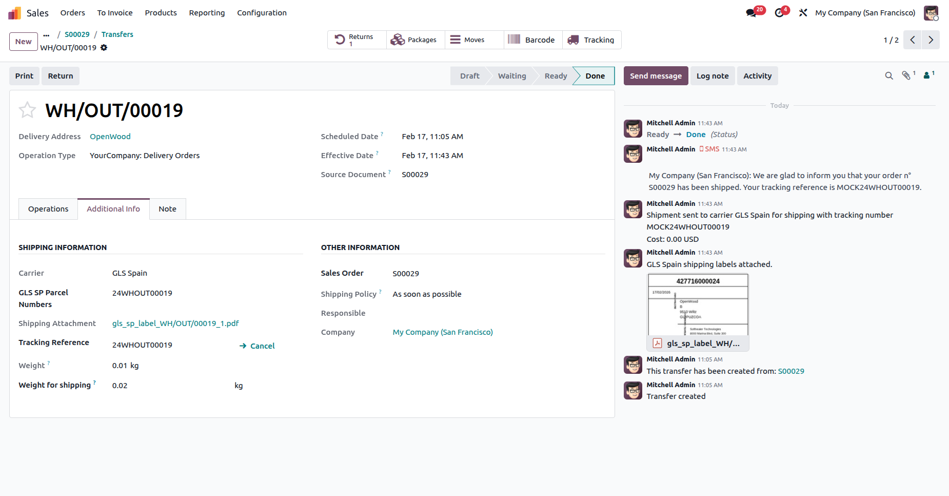 The delivery order with details in the backend. It displays the Shipping Information under the Additional Info tab after generating the label. In the log note, it shows that the shipping label was successfully generated, along with a downloadable PDF link.