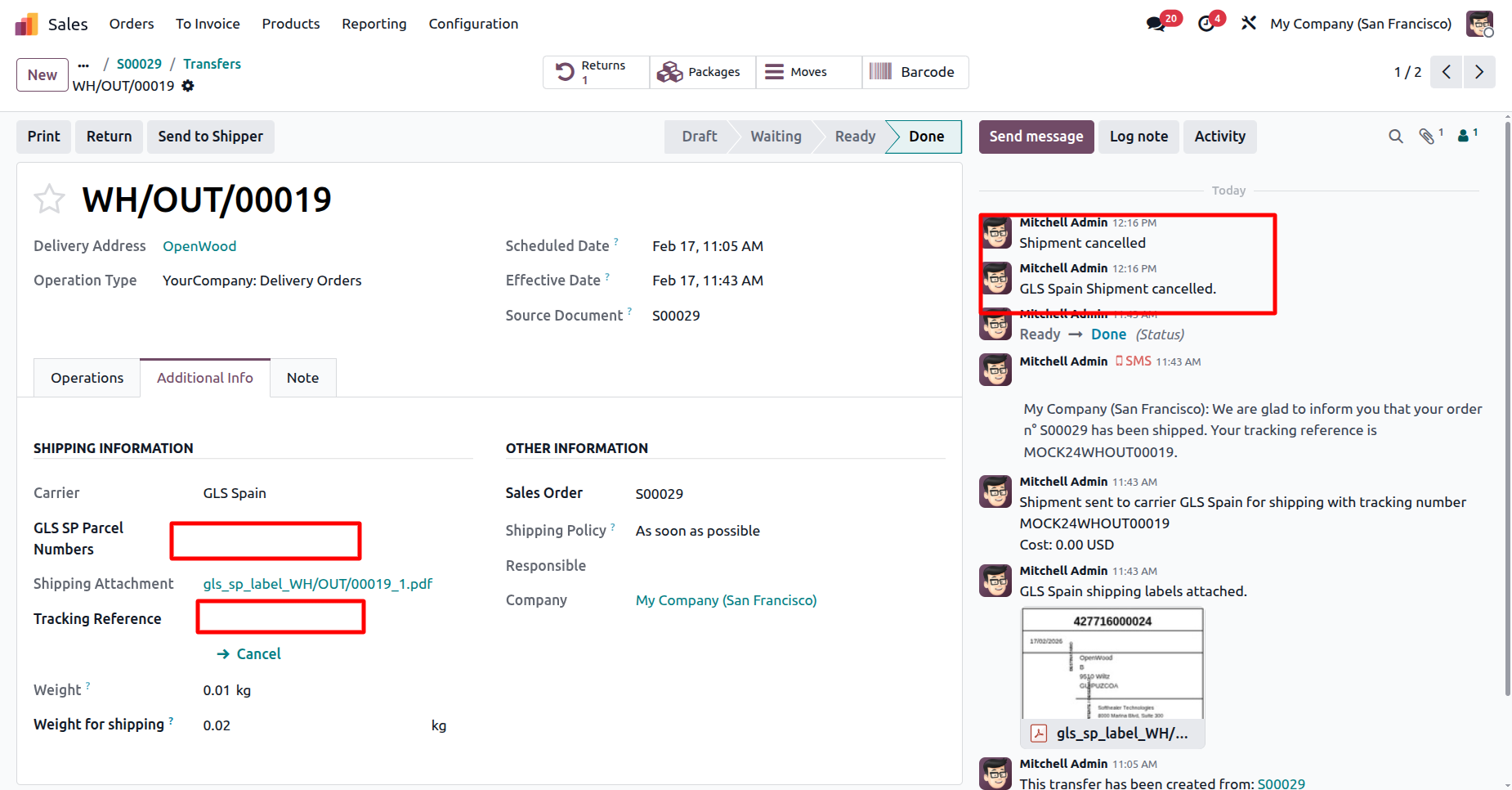 Shipment cancelled with a chatter message.