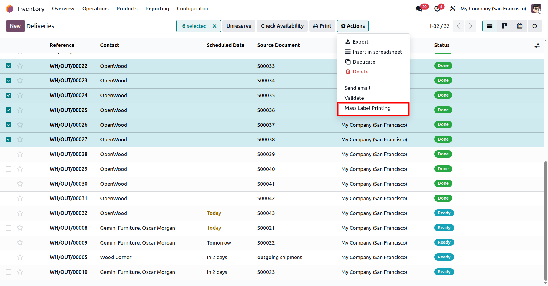 Select deliveries and click Action -> Mass Label Printing.