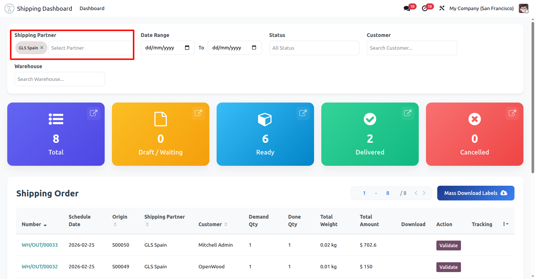 Filter the Shipping Dashboard by a specific Shipping Partner, such as GLS Spain, to instantly isolate and review that shipping partner's open orders and delivery metrics.
