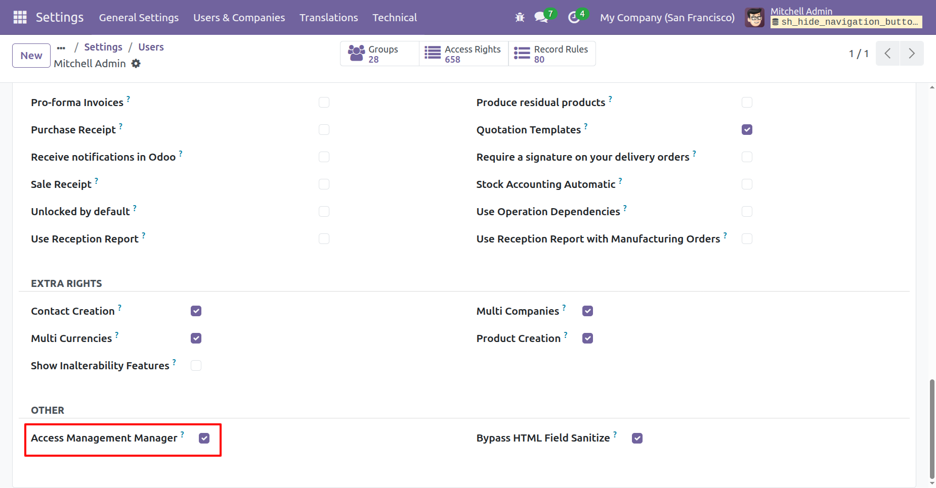 This module is useful to hide/show the Navigation button from whole odoo models for a particular user.