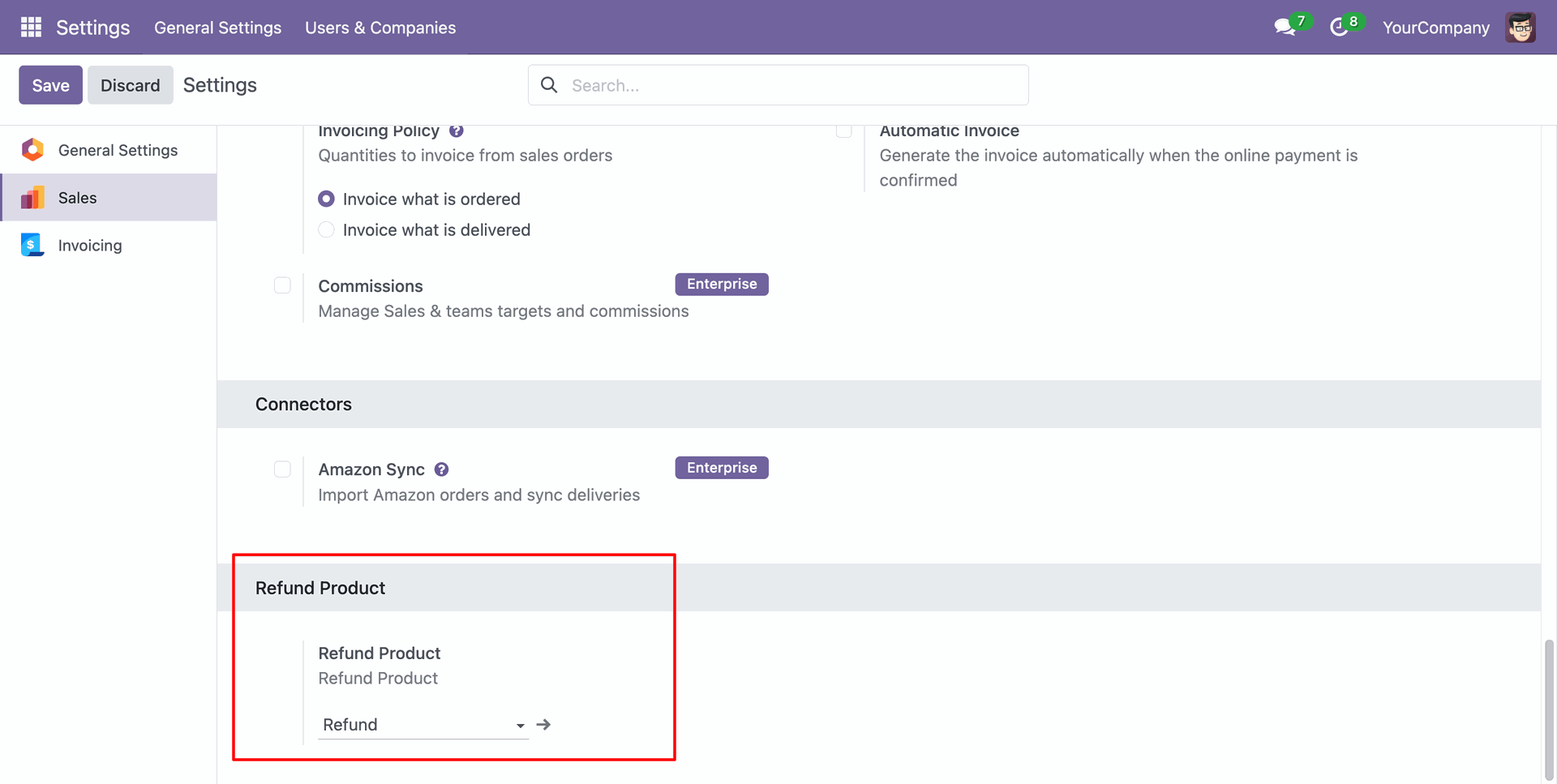Go to the Sales settings and select the "Refund" in the Refund Product.