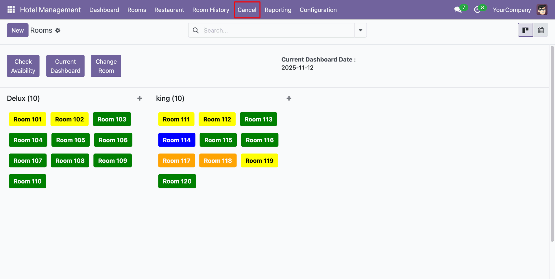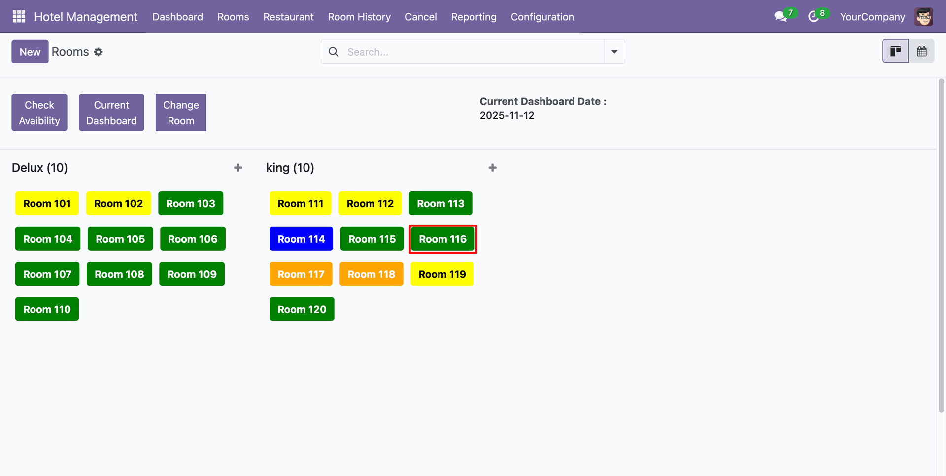 In the Kanban view of the Rooms, you will notice that booked rooms are displayed in red, while available rooms are displayed in green.