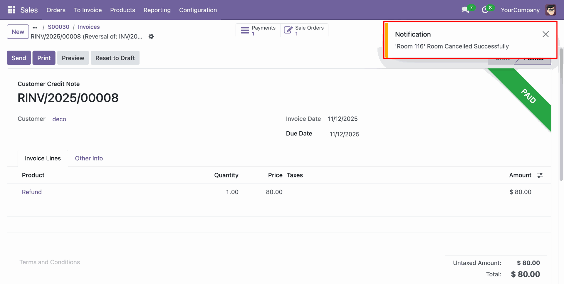 Now, the Sales Order has moved to the “Cancelled” stage, and you can find the two invoices under the “Invoices” smart button.