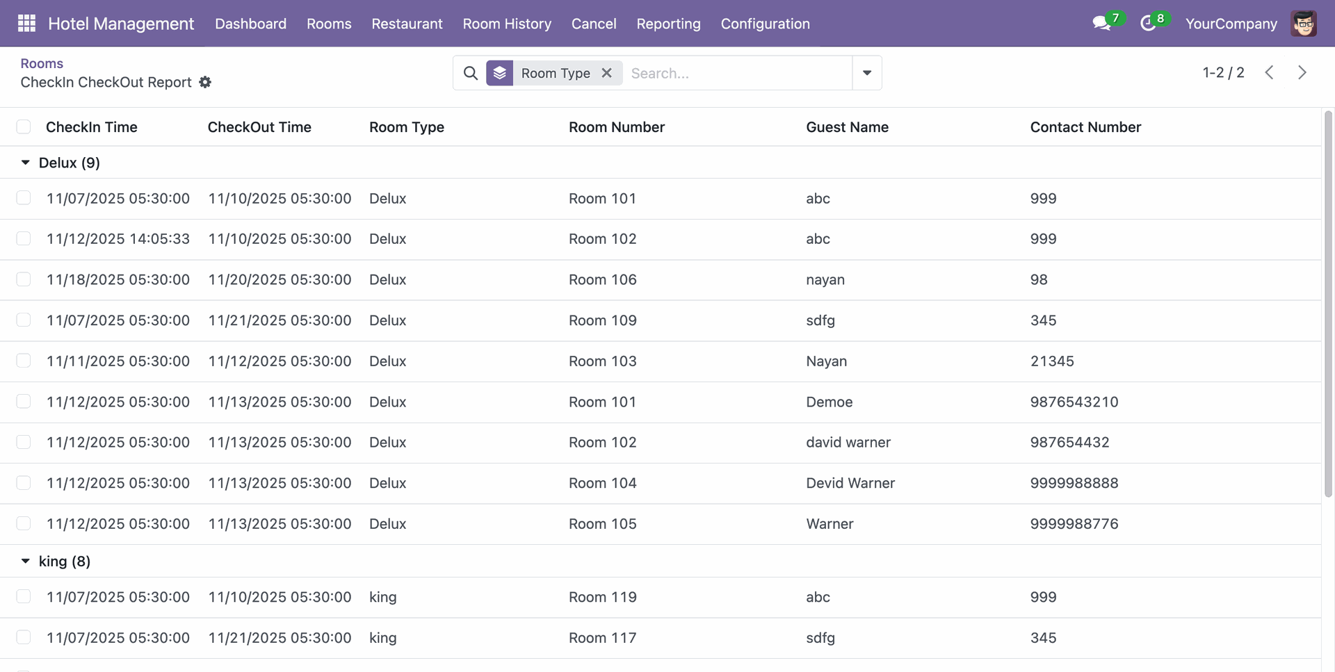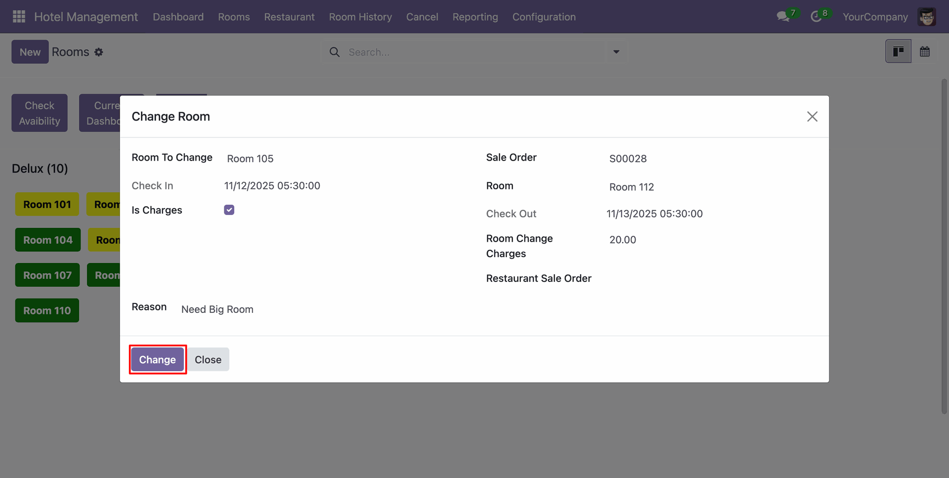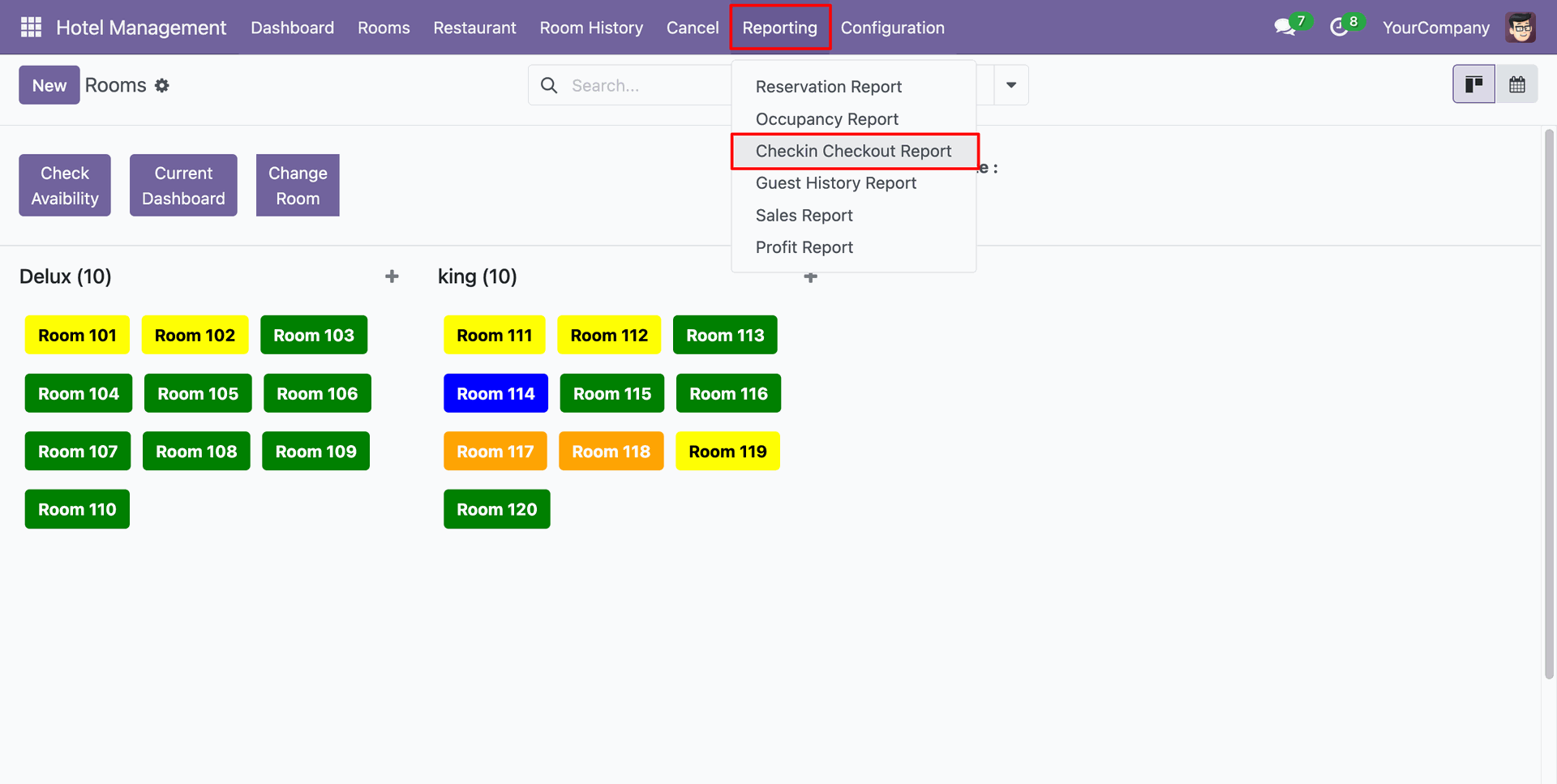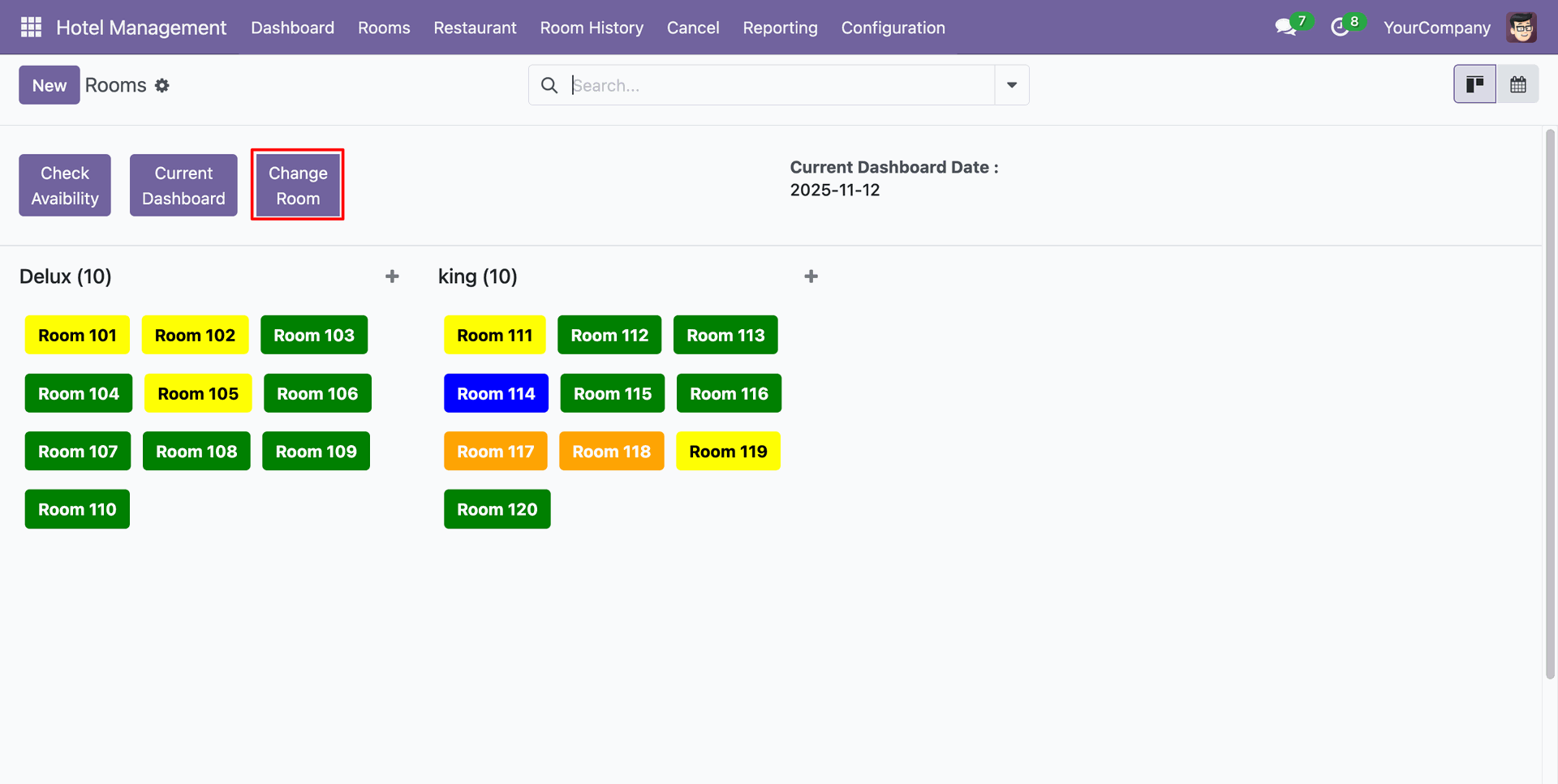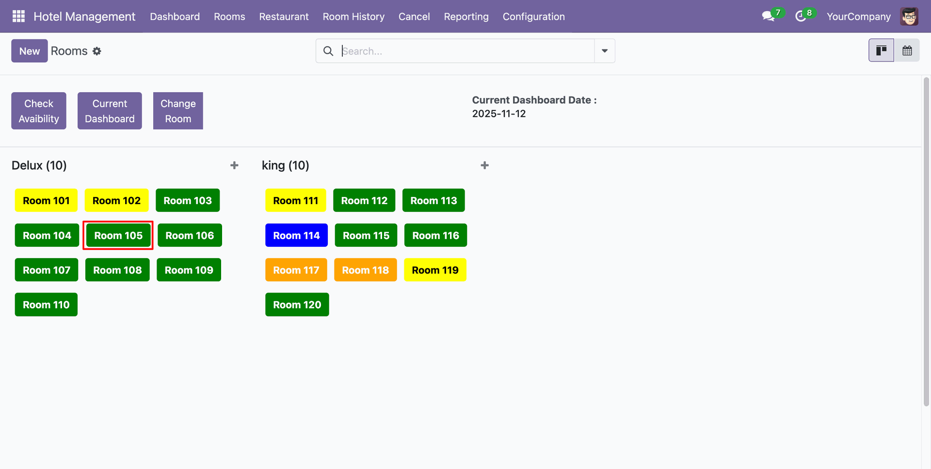 Here, you can see that "Room 105" is now available for booking, and "Room 112" is marked as Checked In.