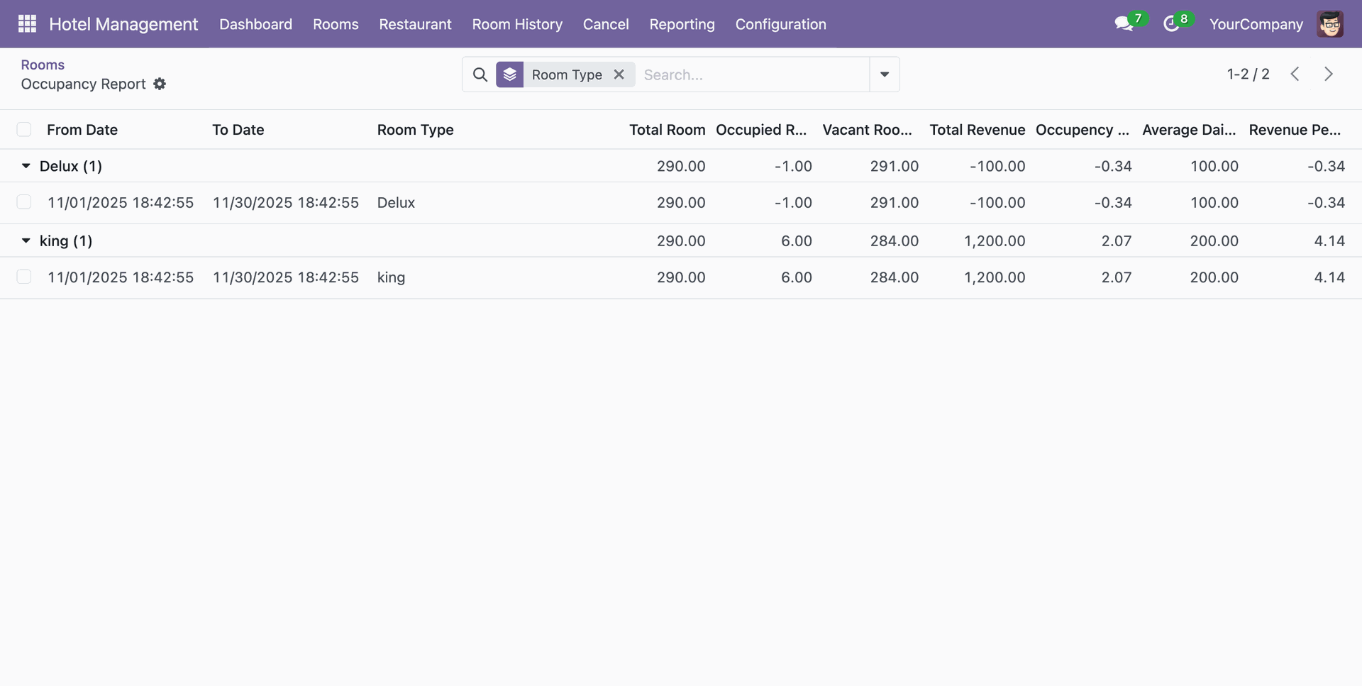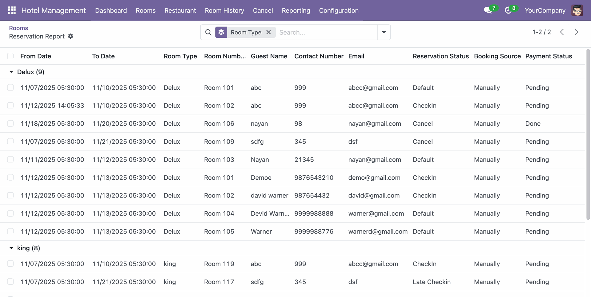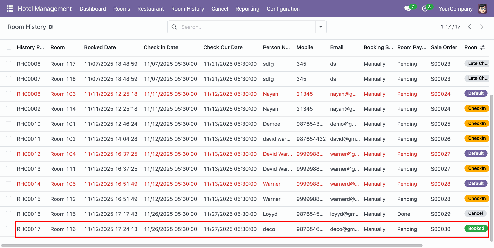In the Kanban view of the Rooms, you will notice that booked rooms are displayed in red, while available rooms are displayed in green.