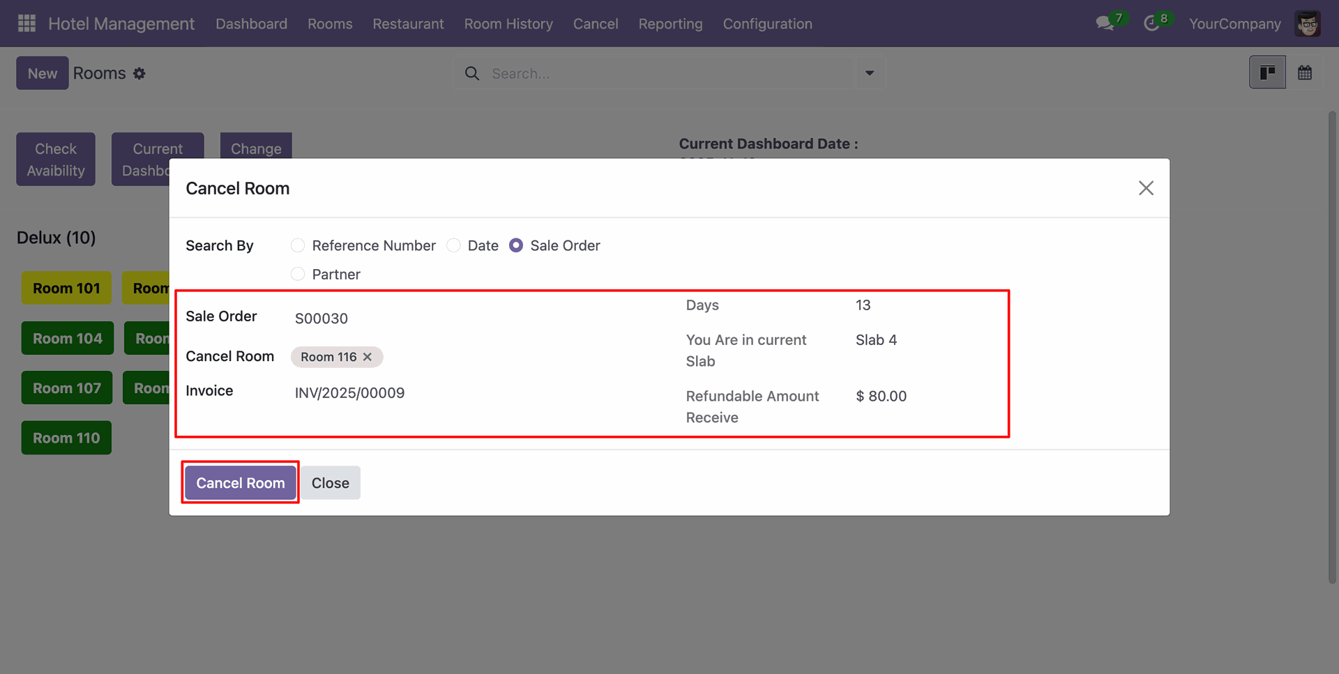 Select “Search By: Sale Order”, add the other details, and click on the “Cancel Room”