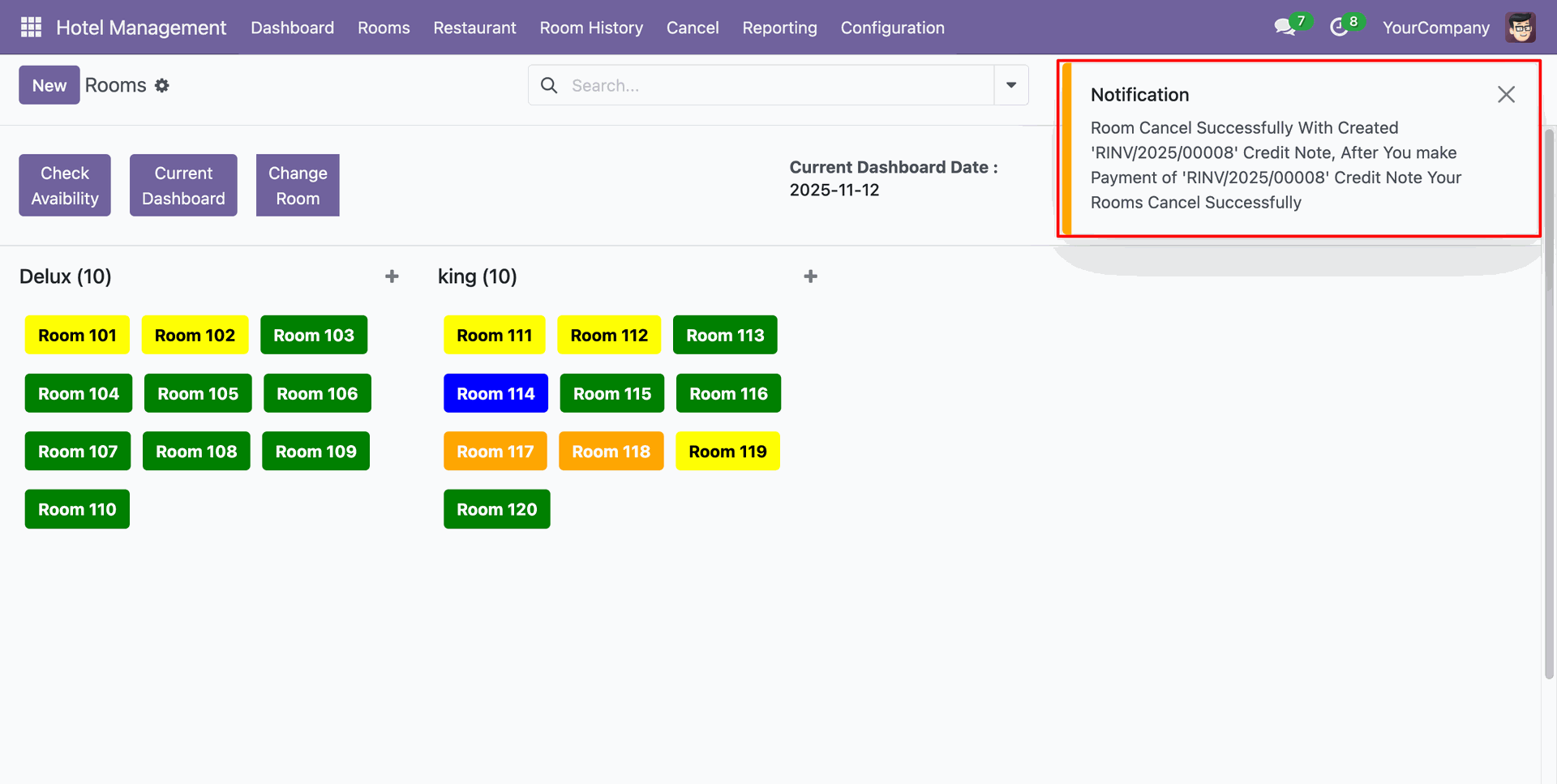 After that, a notification popup will appear saying “Room 116 Room Cancel Successfully.”