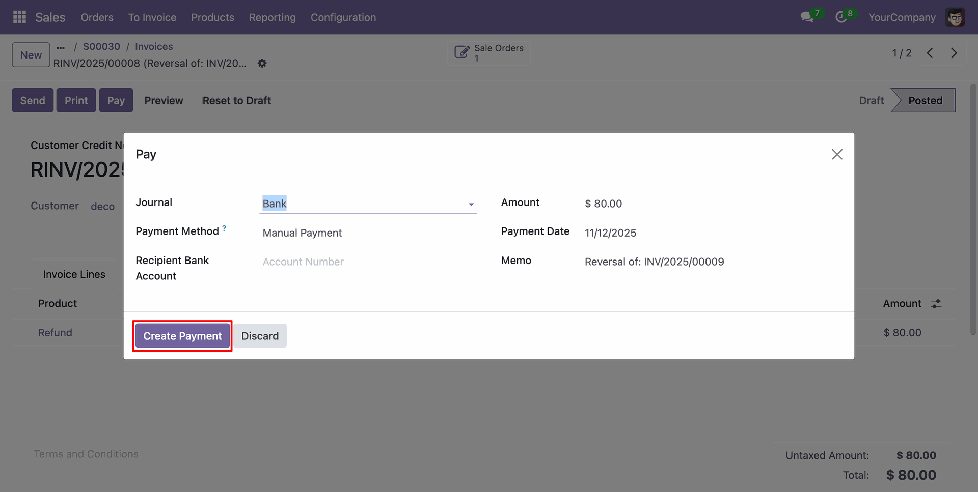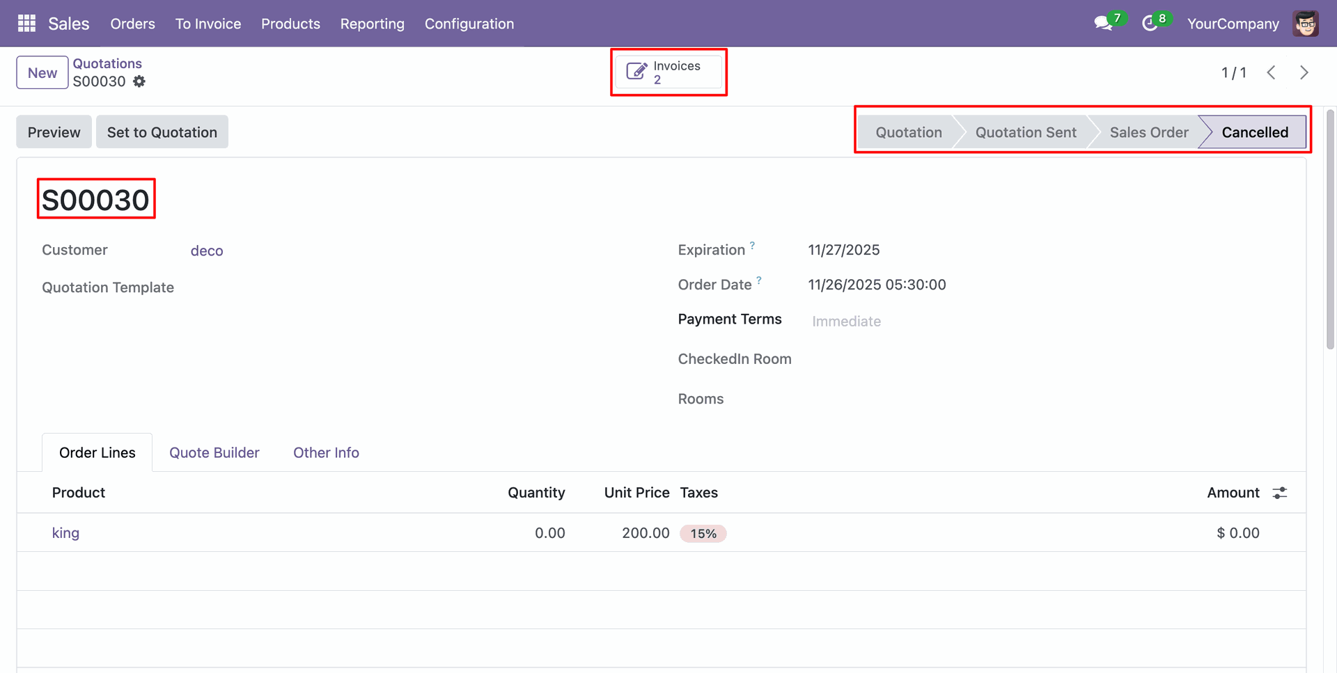 Now, the Sales Order has moved to the “Cancelled” stage, and you can find the two invoices under the “Invoices” smart button.