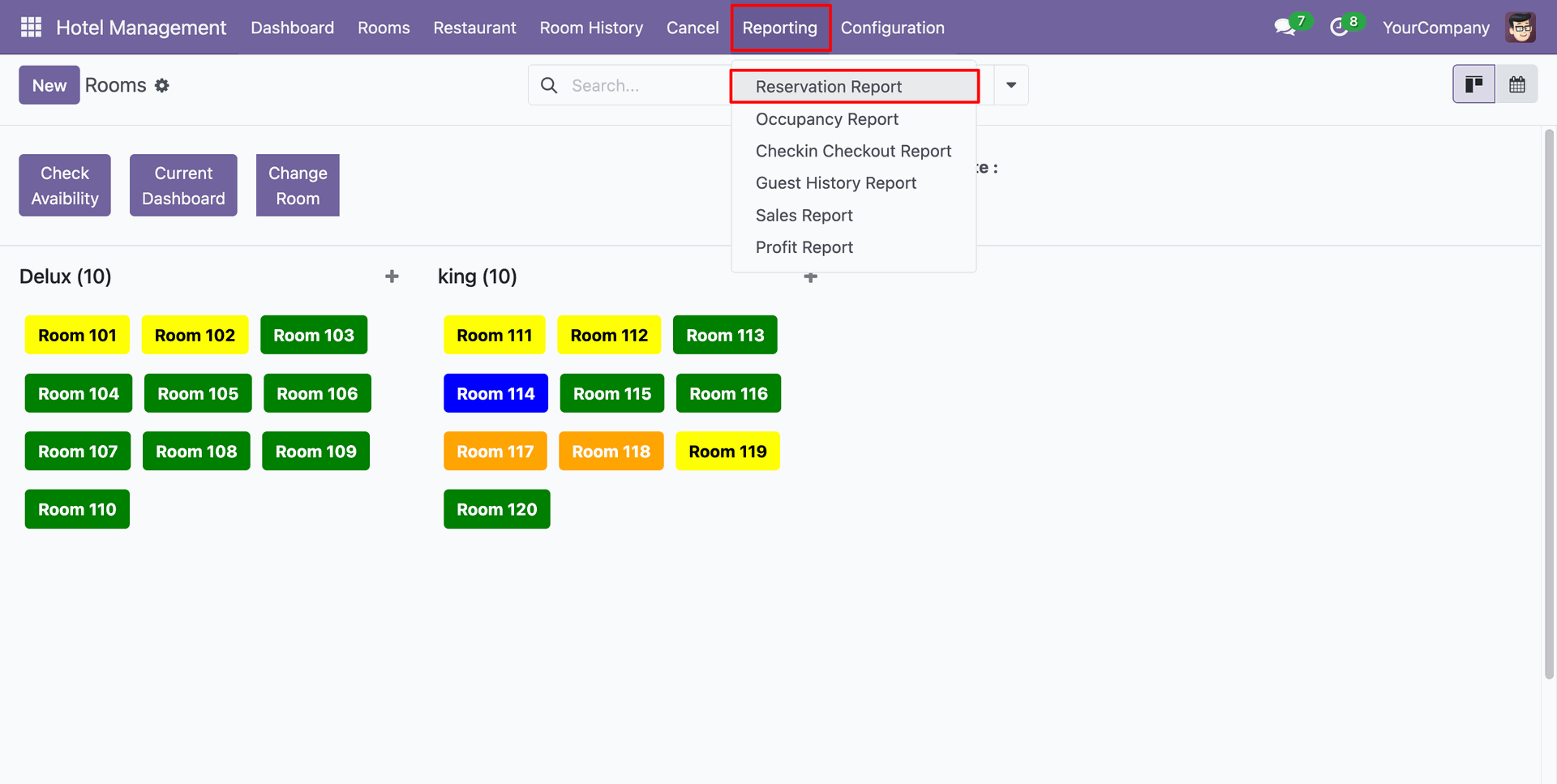Are you looking for an efficient solution to manage your hotel operations seamlessly? Look no further! Our hotel management module is designed to meet all your needs. With this app, you can effortlessly manage rooms of various types and amenities group according to room specifications. You can instantly identify the status of each room through our colorful dashboard, where different colors represent different room statuses.