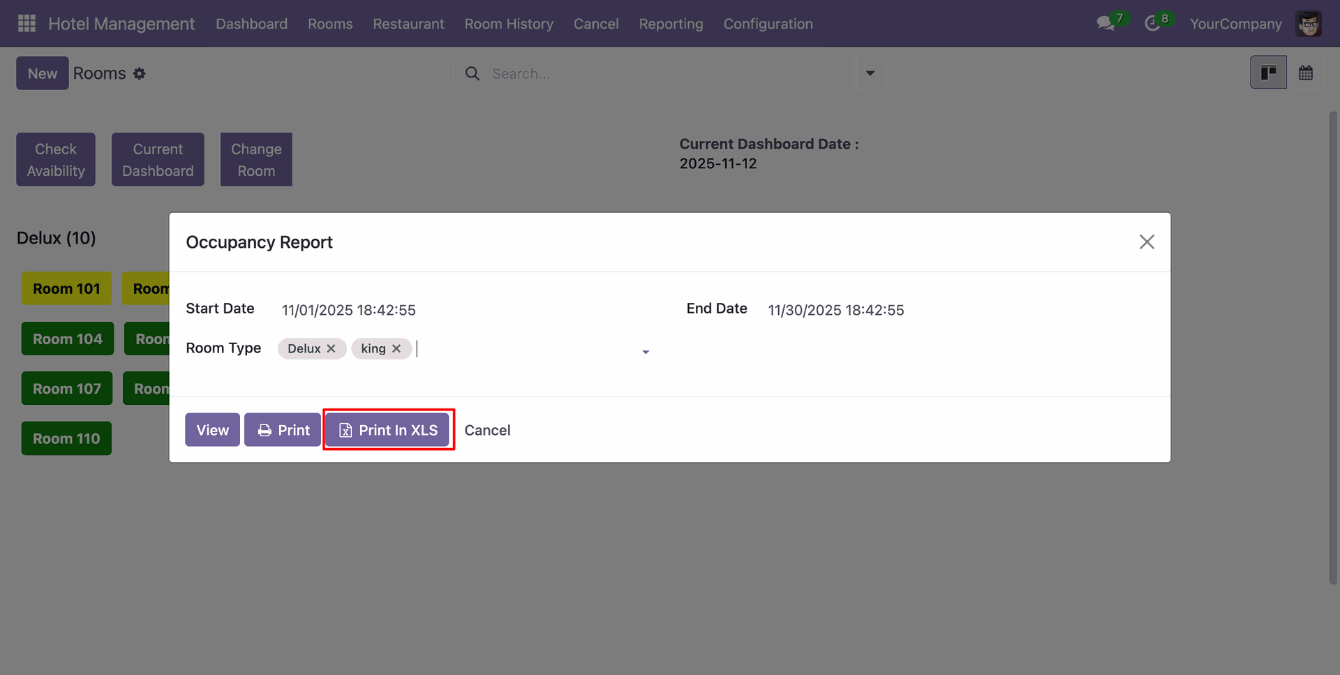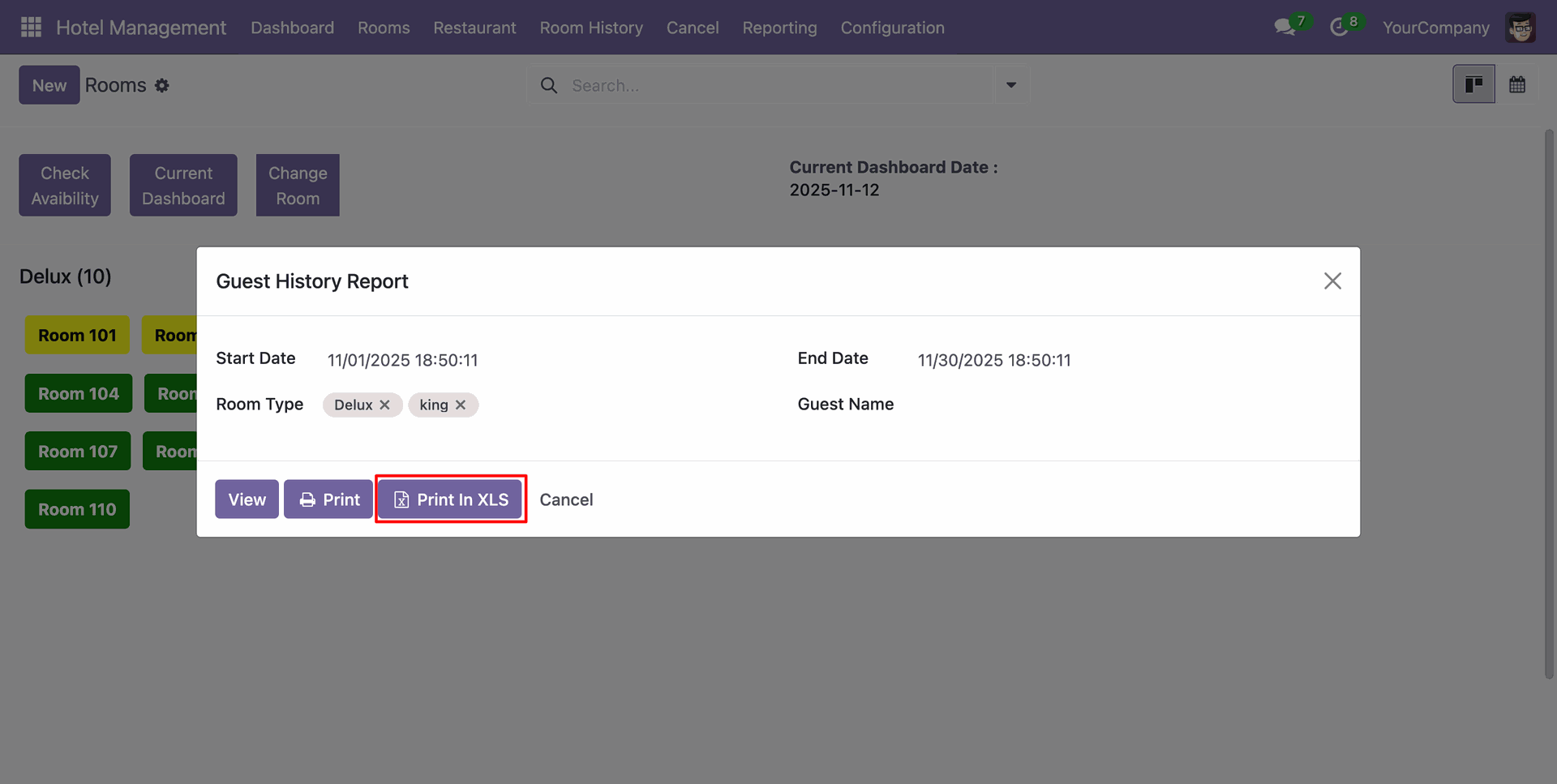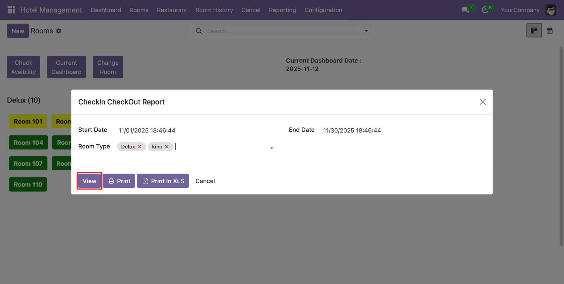 Here, you can see that "Room 105" is now available for booking, and "Room 112" is marked as Checked In.