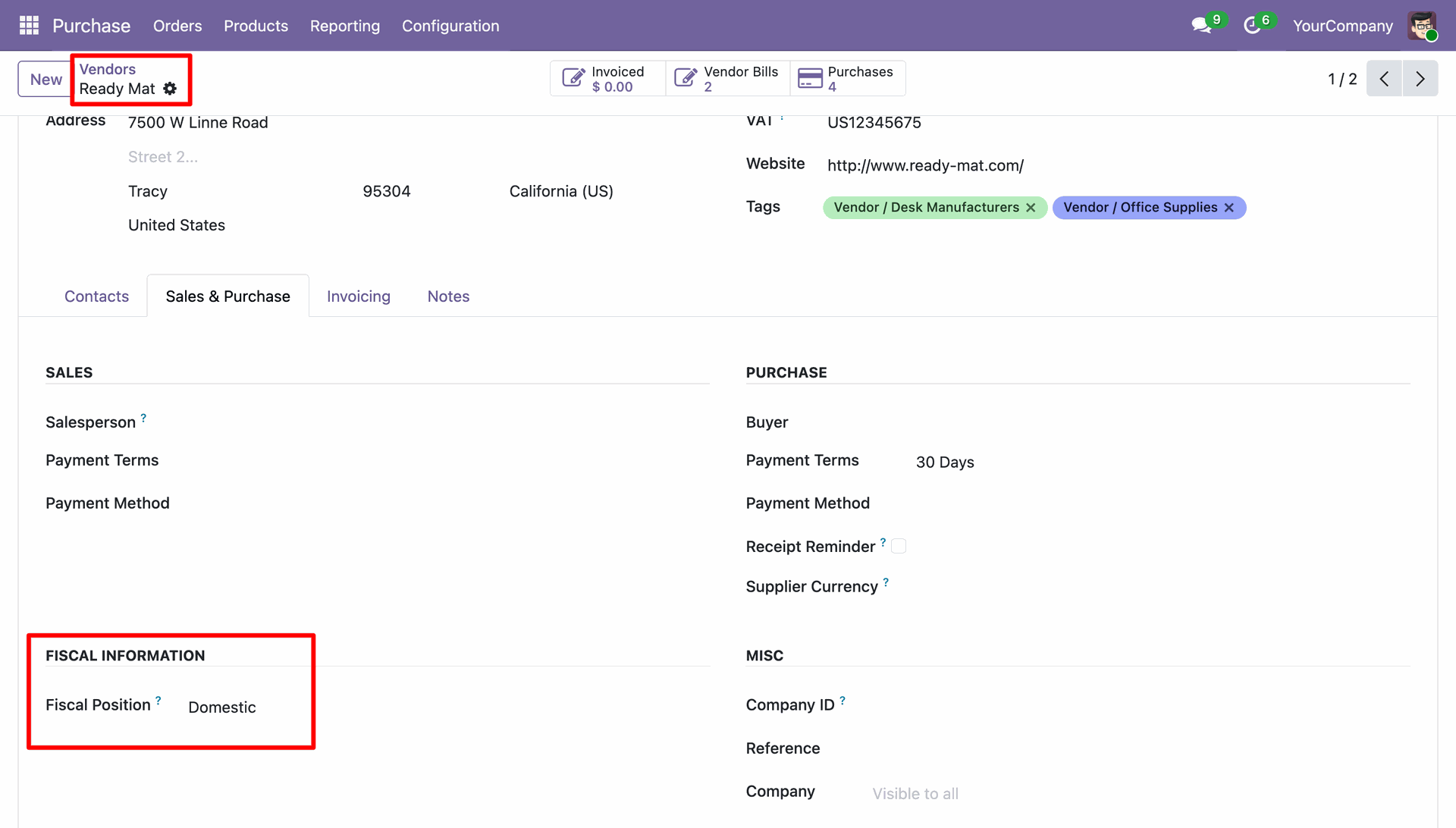 Here we set the Fiscal Position: Domestic under the 'Sales & Purchase' tab.