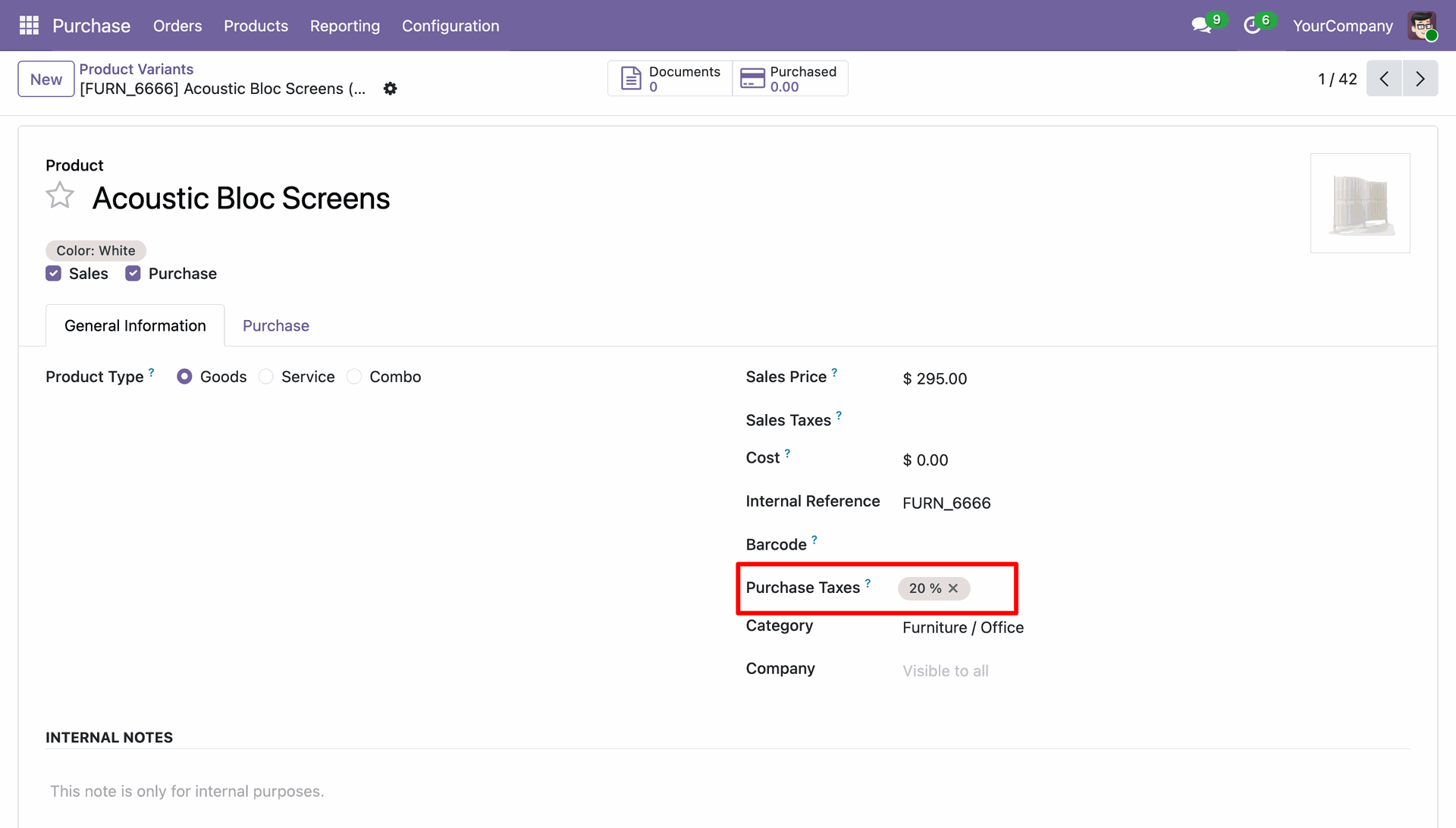 In the XLS file, we have not set a tax on the 'Acoustic Bloc Screens' product.
