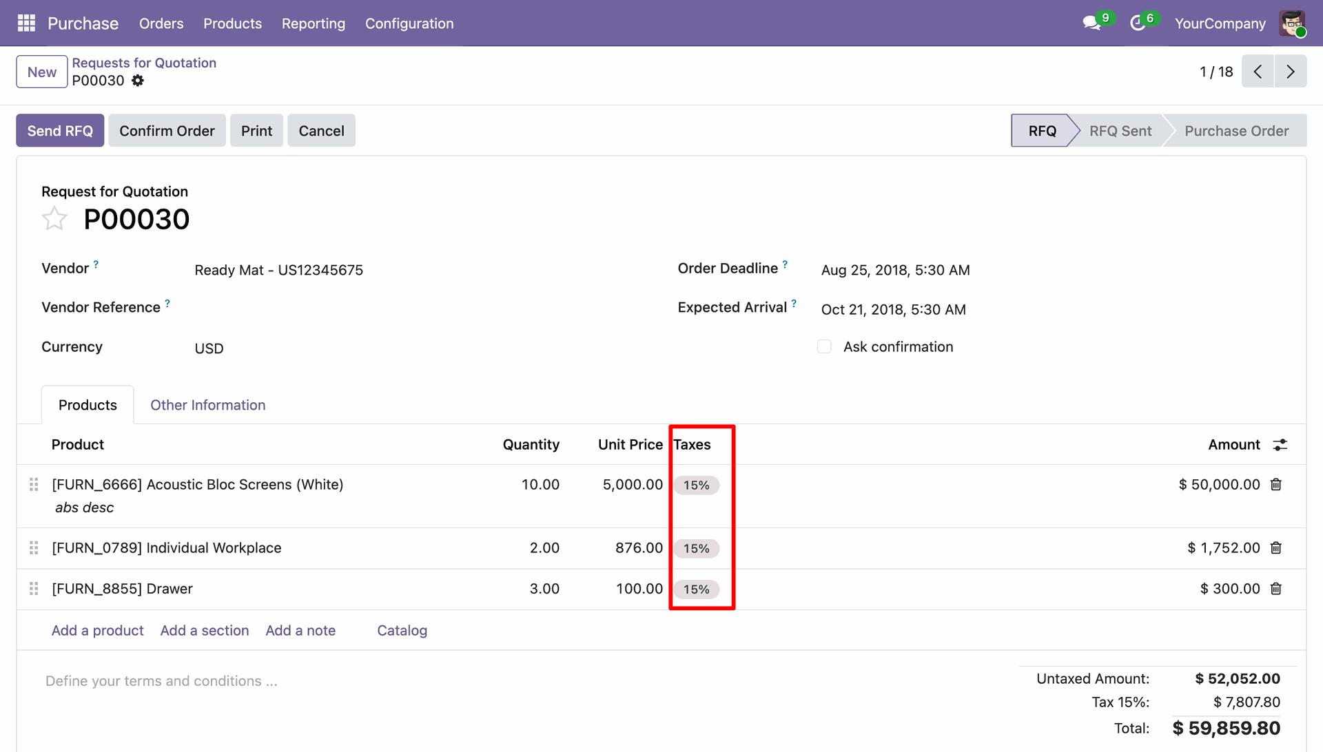 Here, you can see that the 'Acoustic Bloc Screens' product tax has been updated to 15% based on the Fiscal Position.