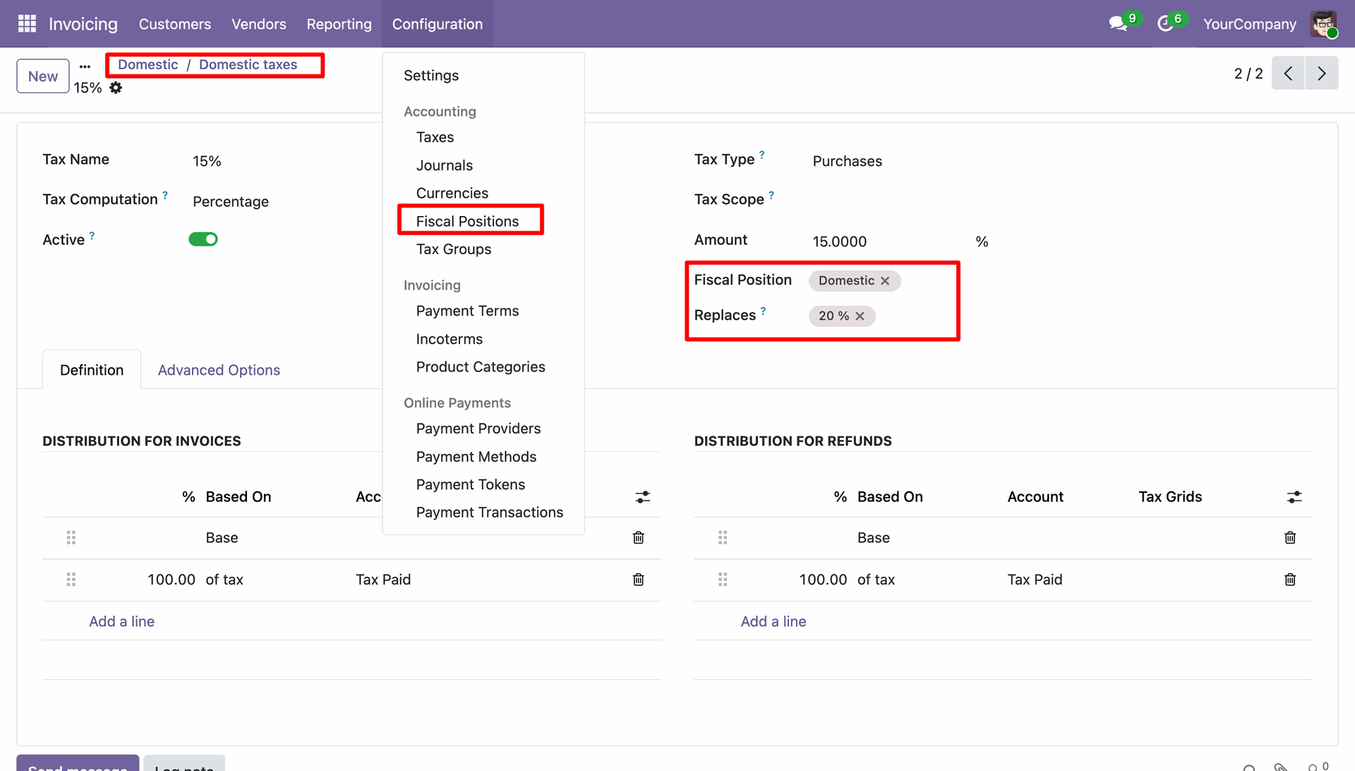 purchase tax and the vendor is assigned a 'Domestic' Fiscal Position that maps 20% to 15%, then it will