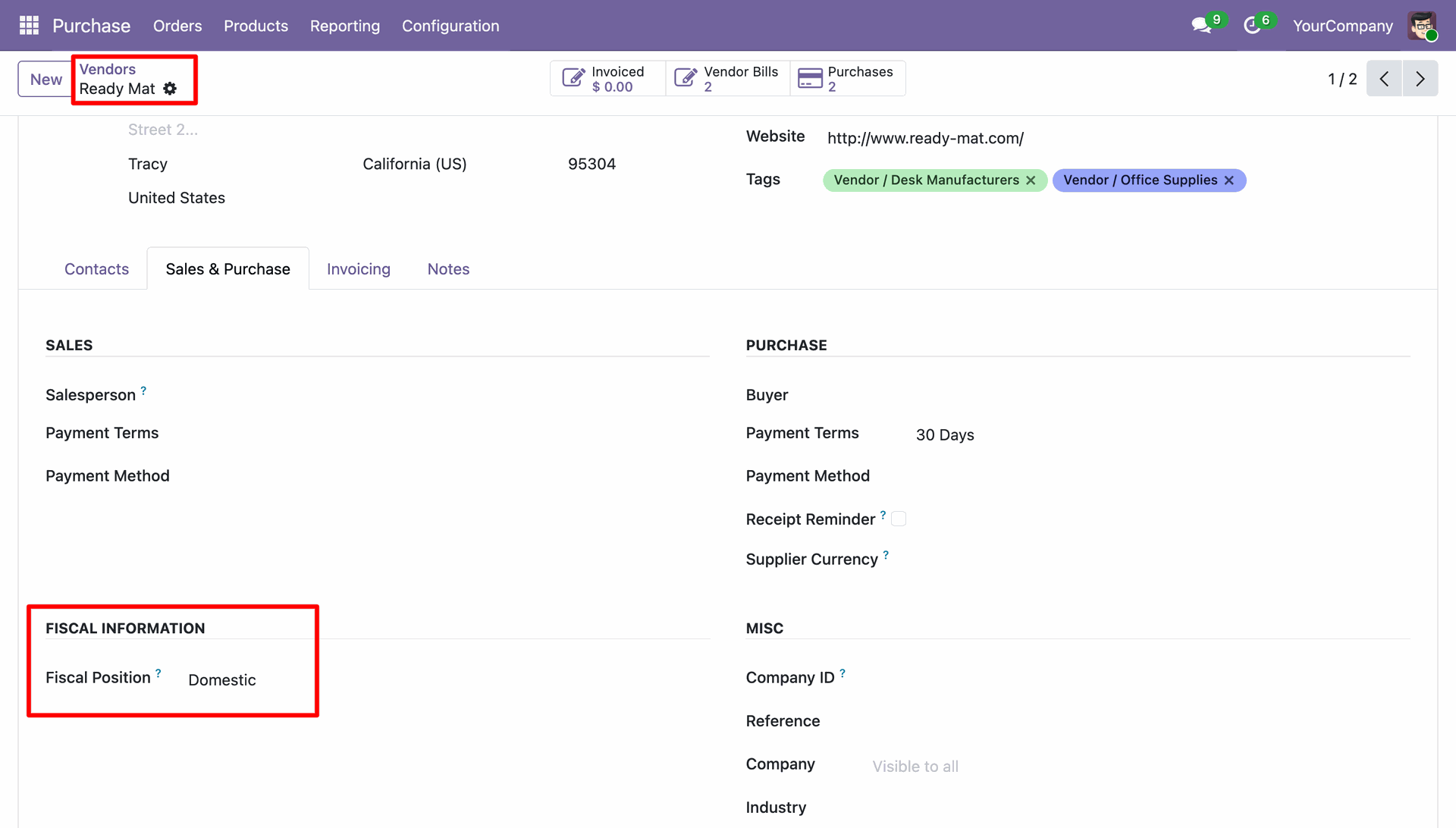 Here we set the Fiscal Position: Domestic under the 'Sales & Purchase' tab.