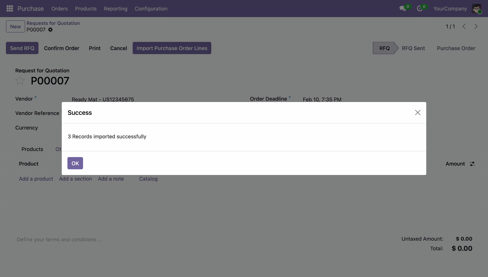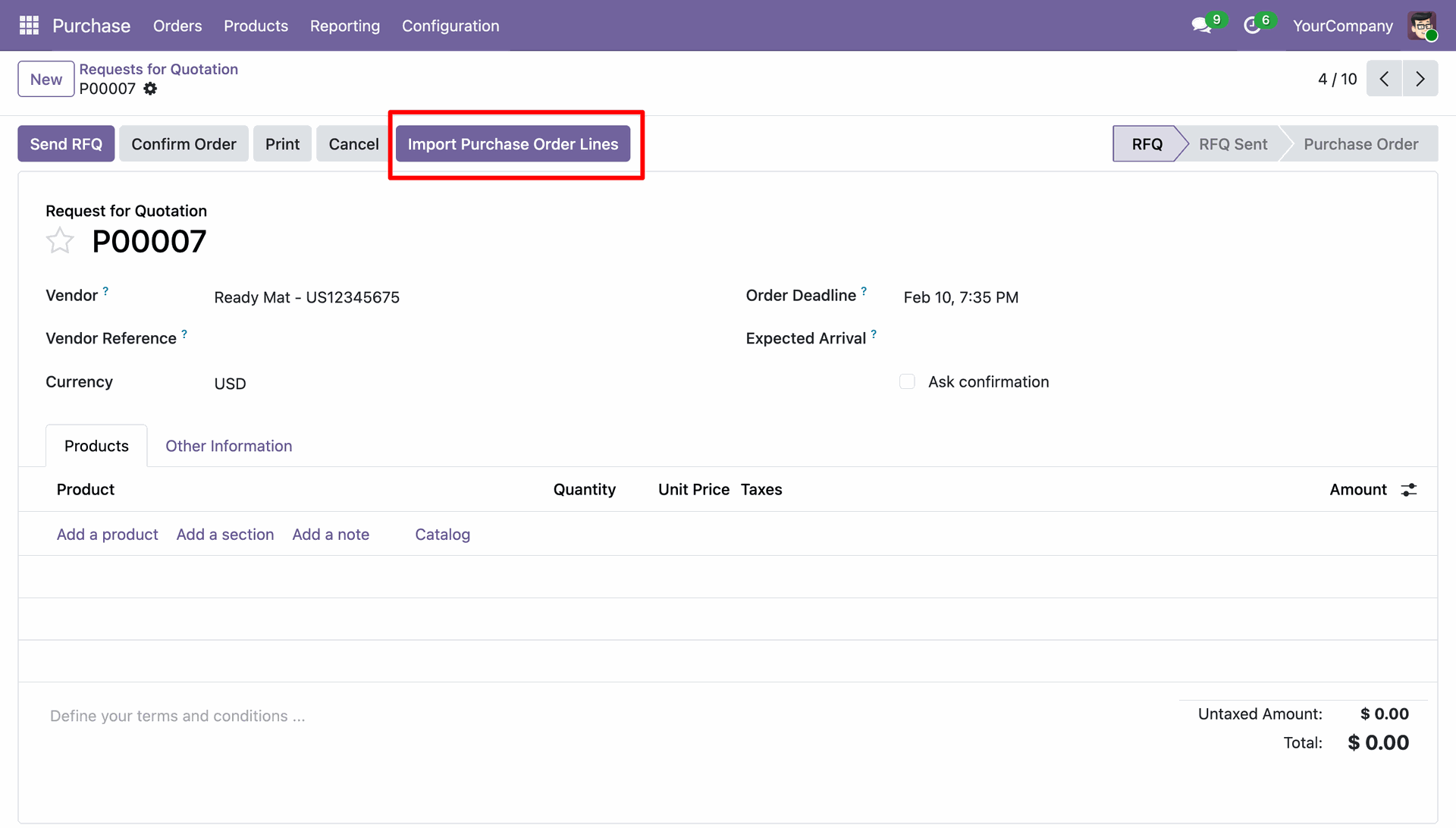 'Import Purchase Order Lines' button in RFQ/Purchase order form view.