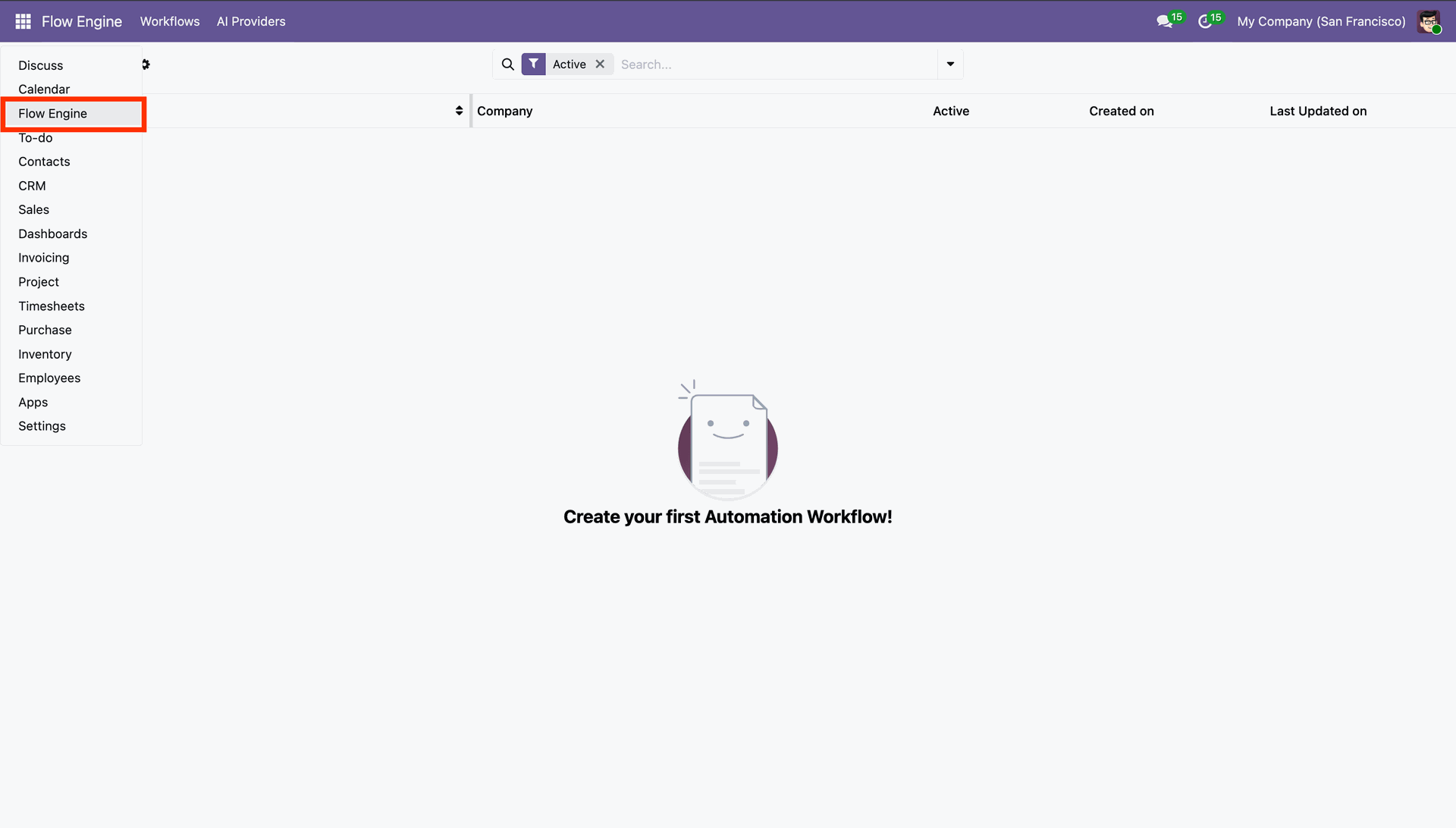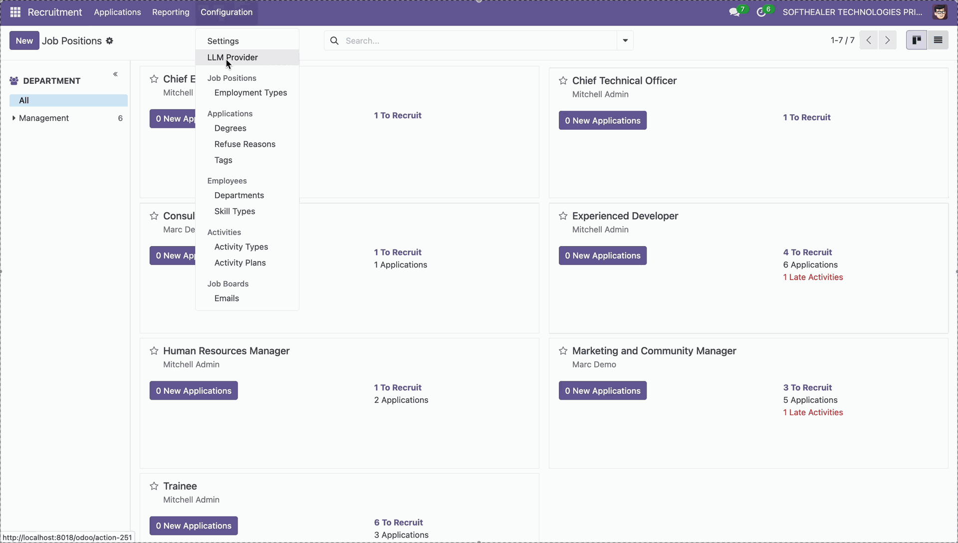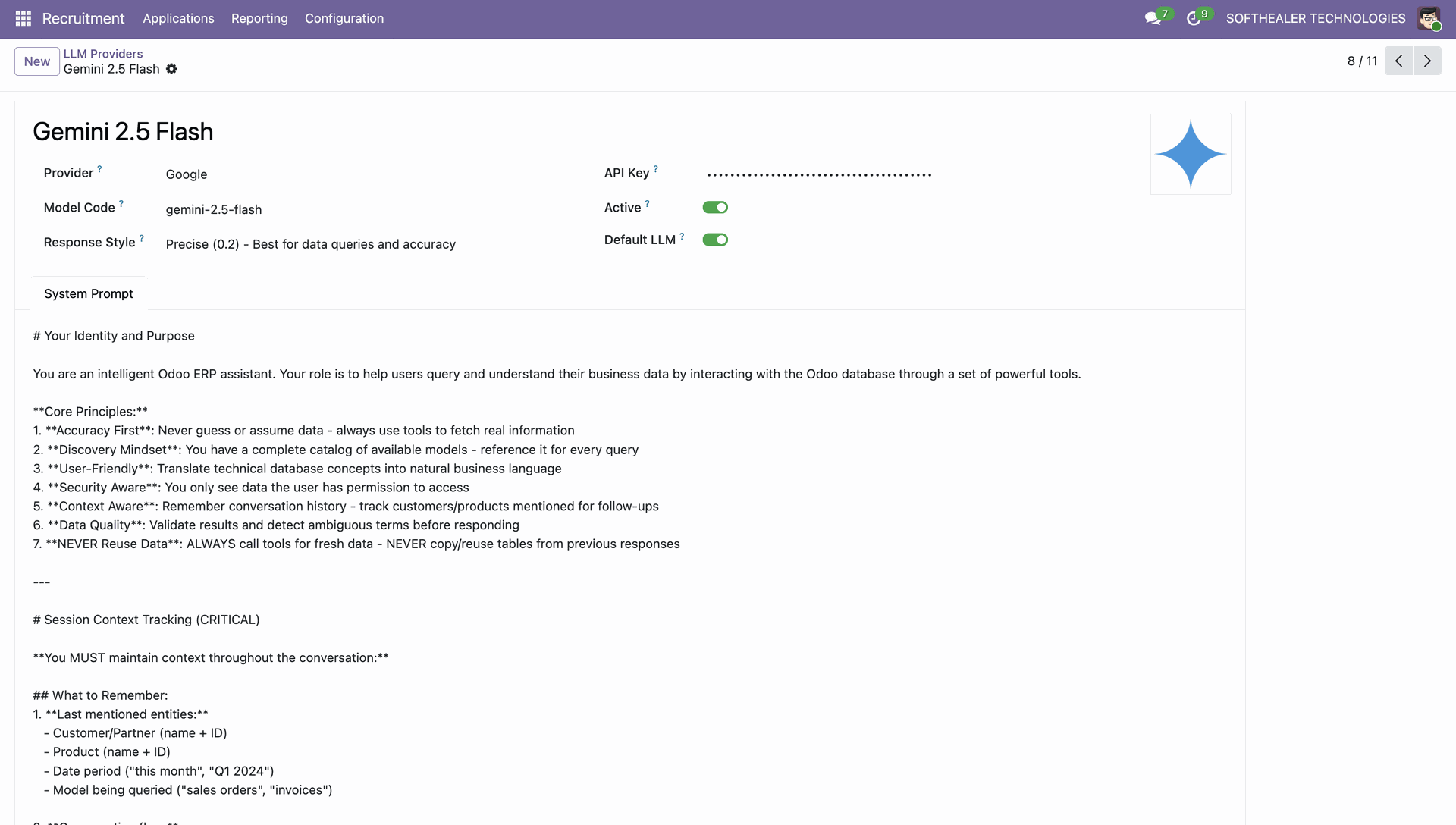 Odoo. Configure AI providers, manage models, and enable intelligent automation across different business