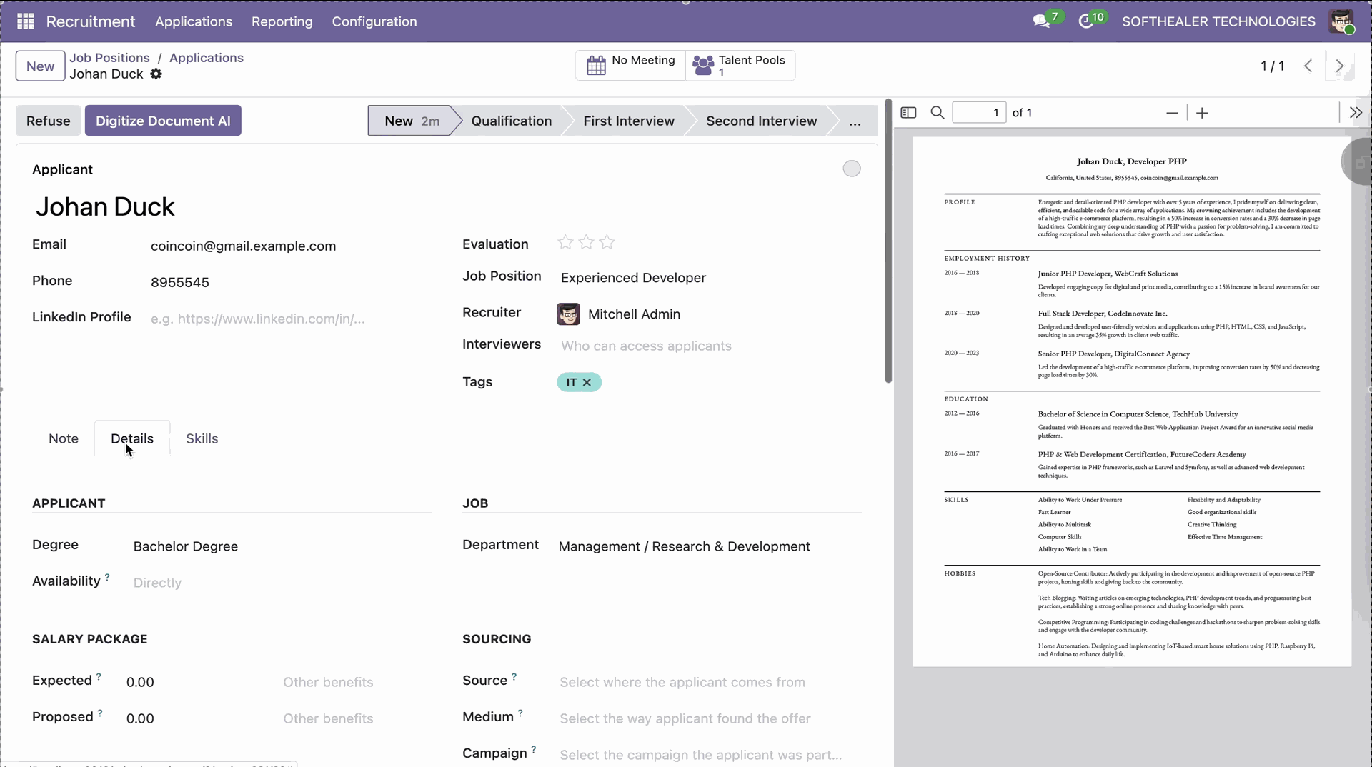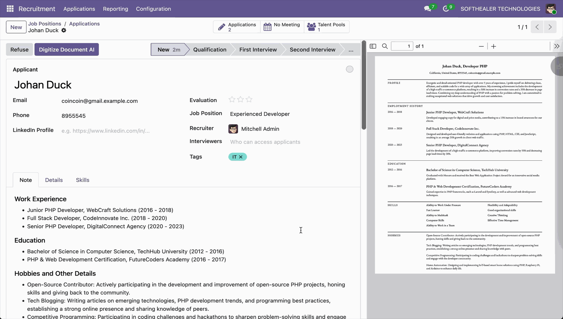 Easily capture and manage candidate information such as name, email, phone number, and tags in a structured format.