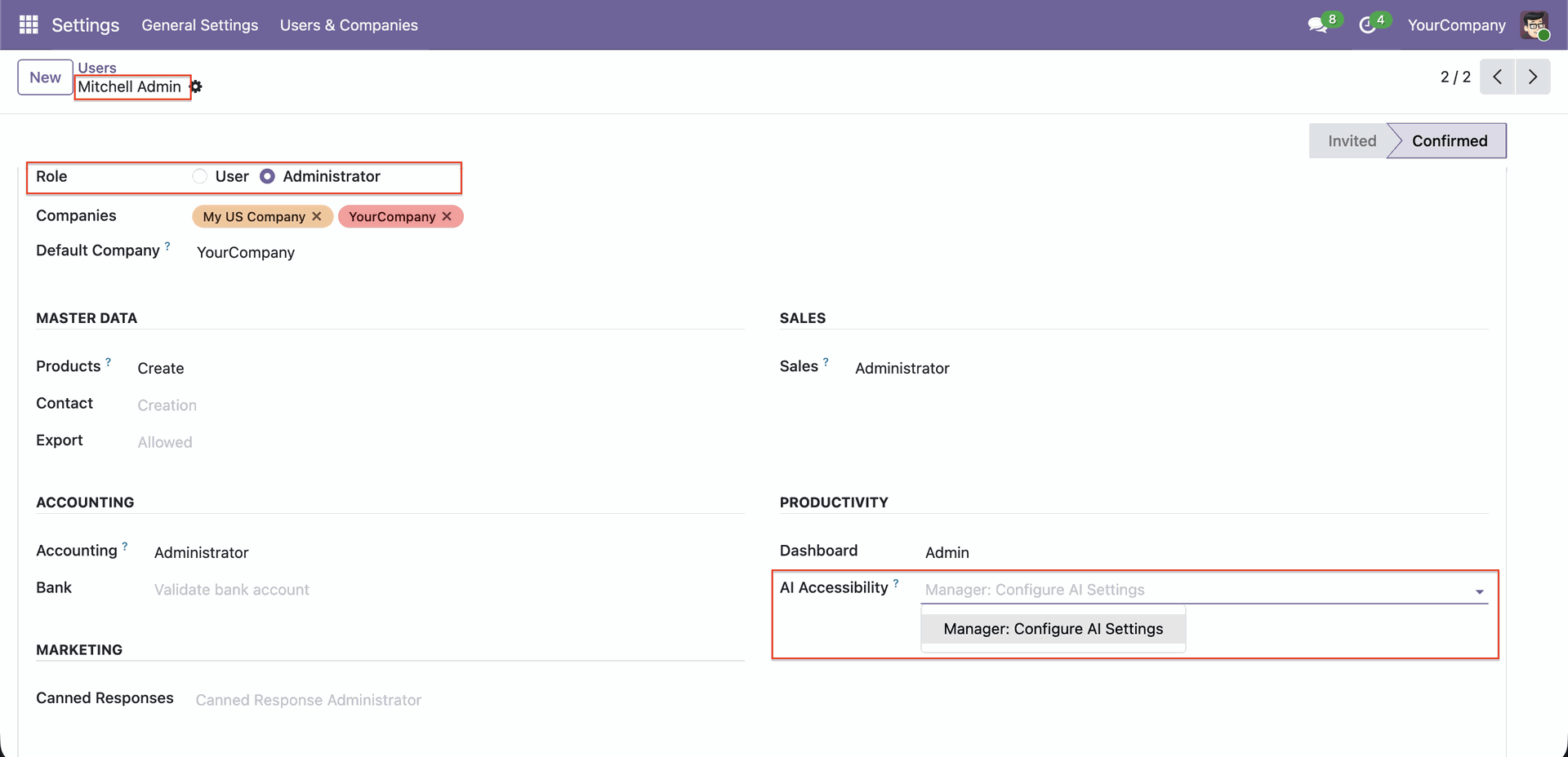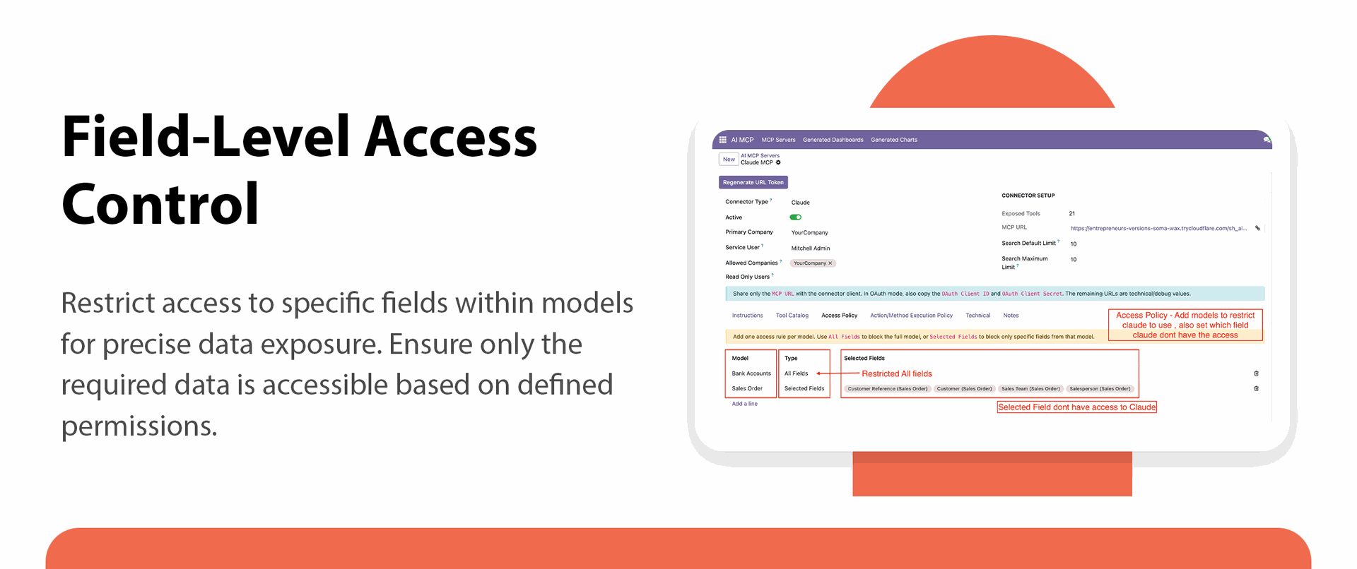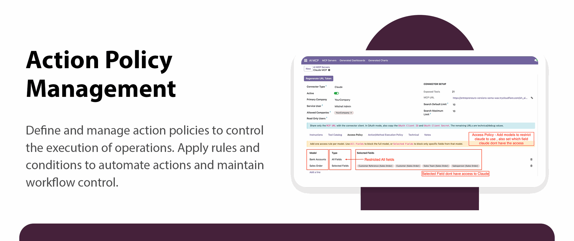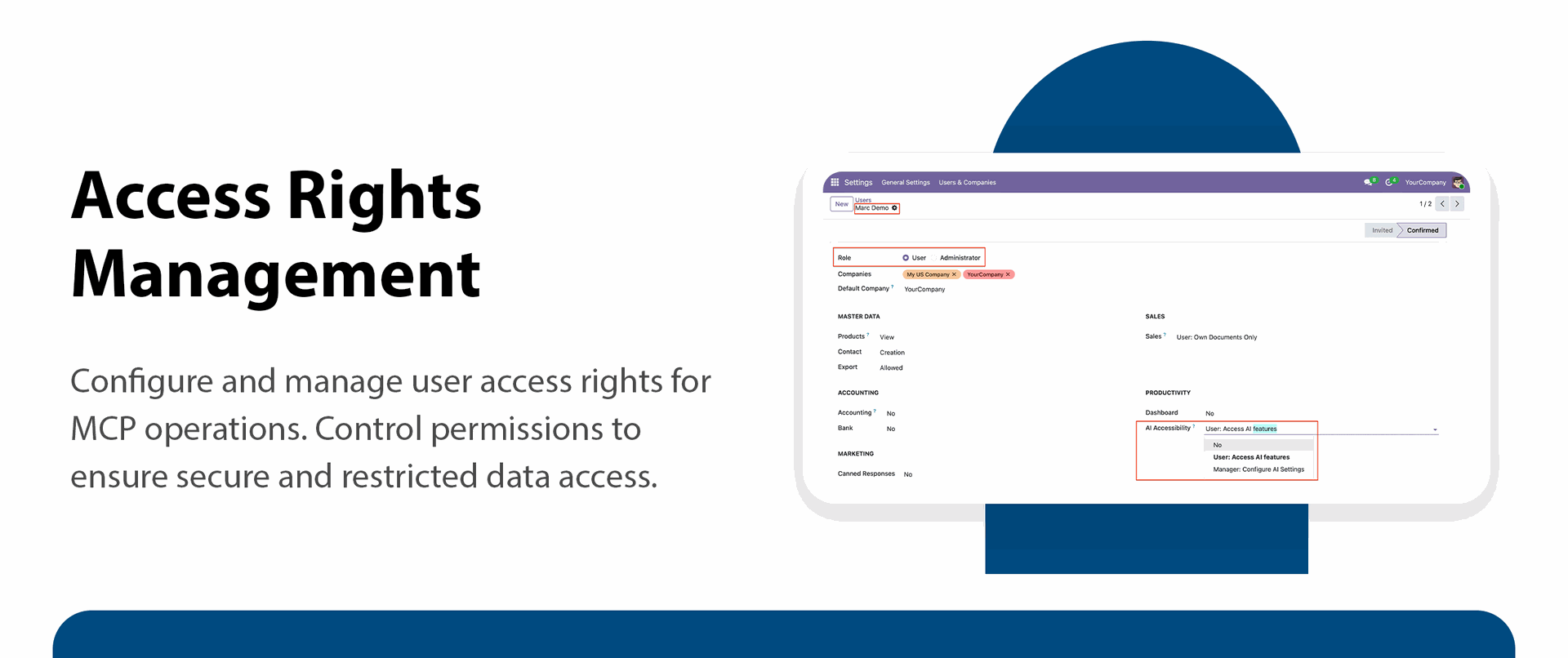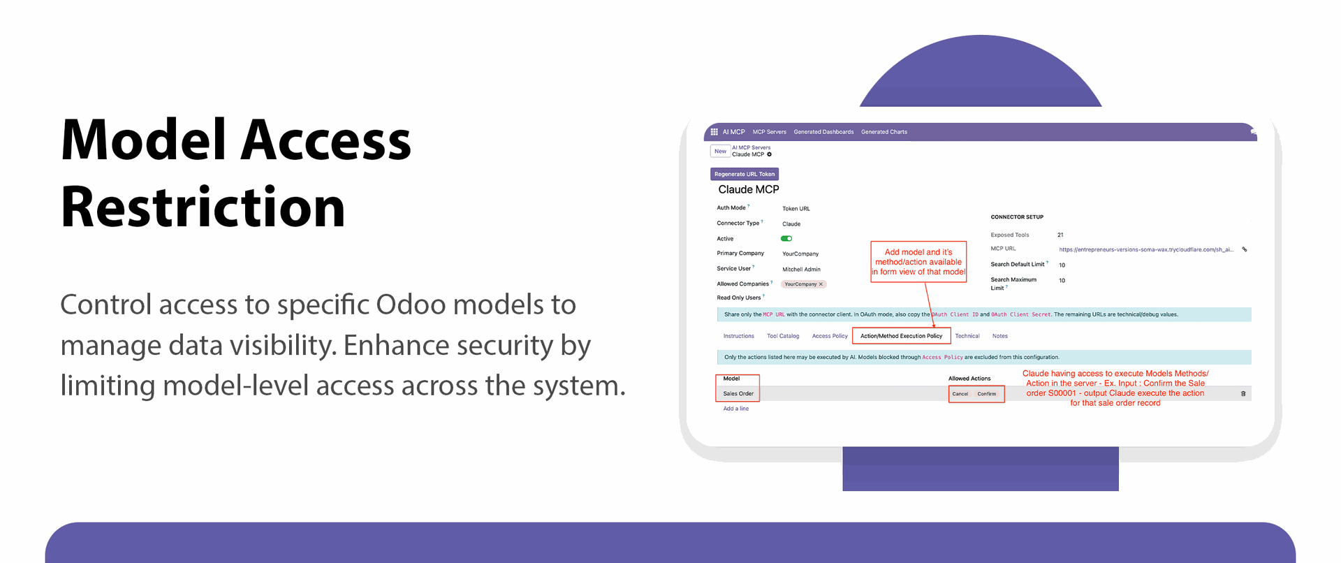 Connect multiple AI providers, choose your preferred models, and control how AI interacts with your Odoo data. Define access rules to ensure AI only creates, updates, or archives records within permitted boundaries — keeping your system secure and compliant.