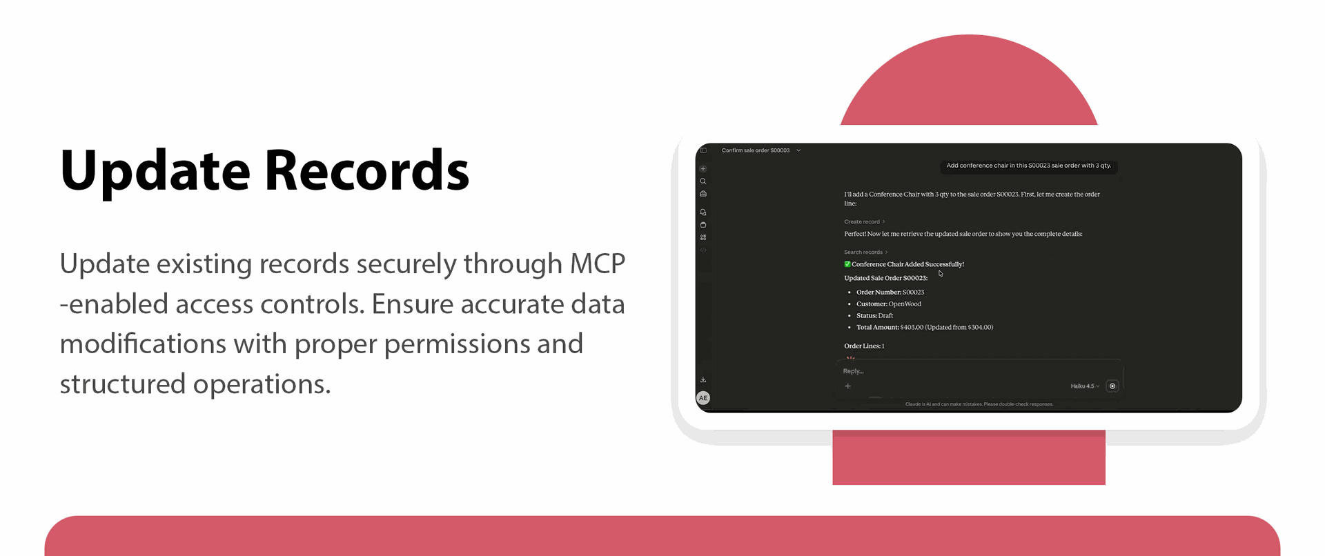 Create new records directly through MCP-enabled secure access. Automate data entry and streamline business processes.