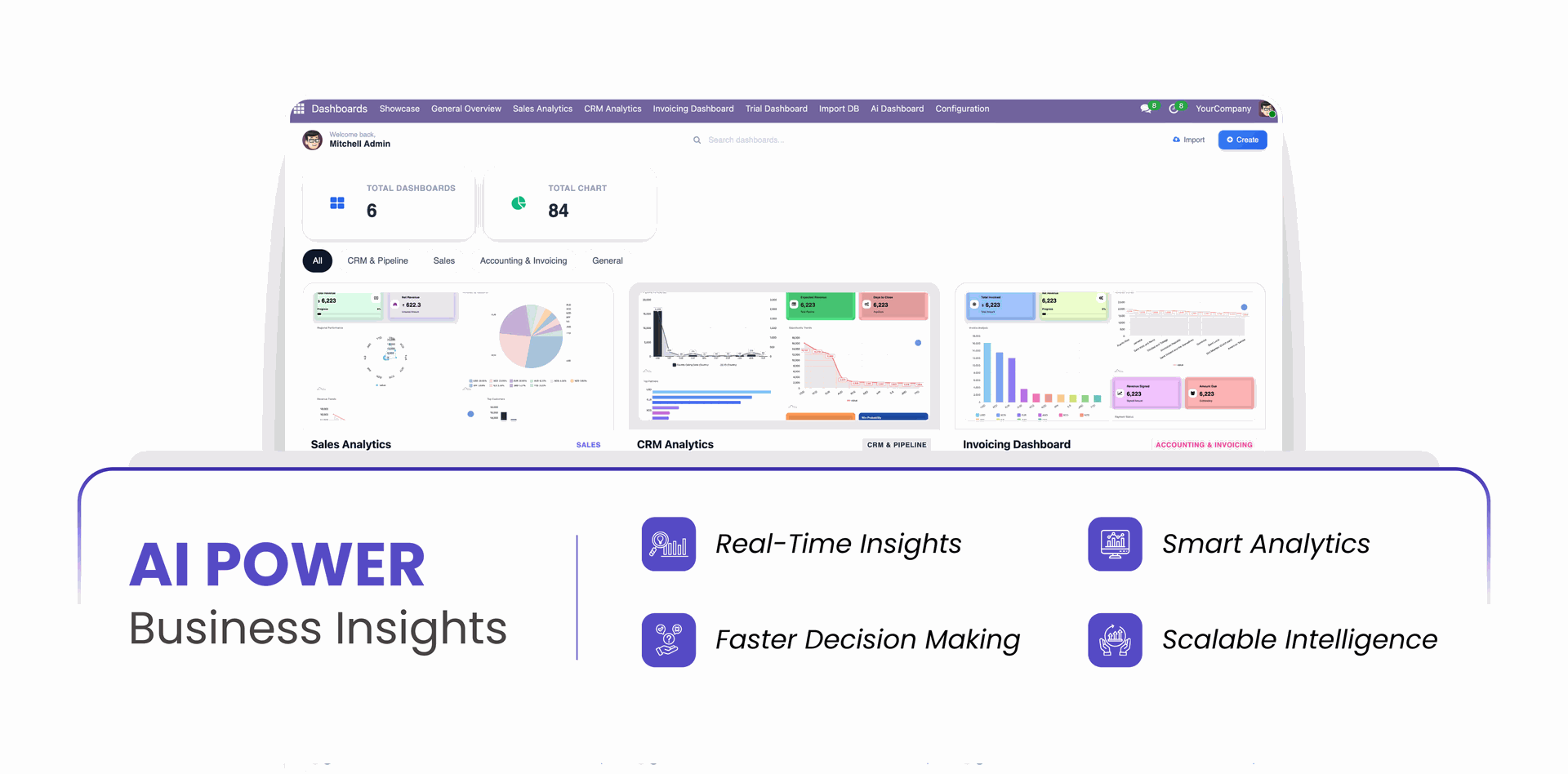 Transform your Odoo data into actionable insights with a powerful and intelligent AI-driven dashboard that brings all your analytics and visual reports into one unified interface. The AI Dashboard Generator module empowers you to build stunning, interactive, and real-time dashboards using advanced charts. This module enables users to monitor performance, analyze trends, and interact with dynamic charts using advanced visualization tools, export options, and real-time customization capabilities. Designed for flexibility and usability, the AI Dashboard provides a modern analytics experience where users can explore data visually, annotate insights, customize themes, and export reports instantly.