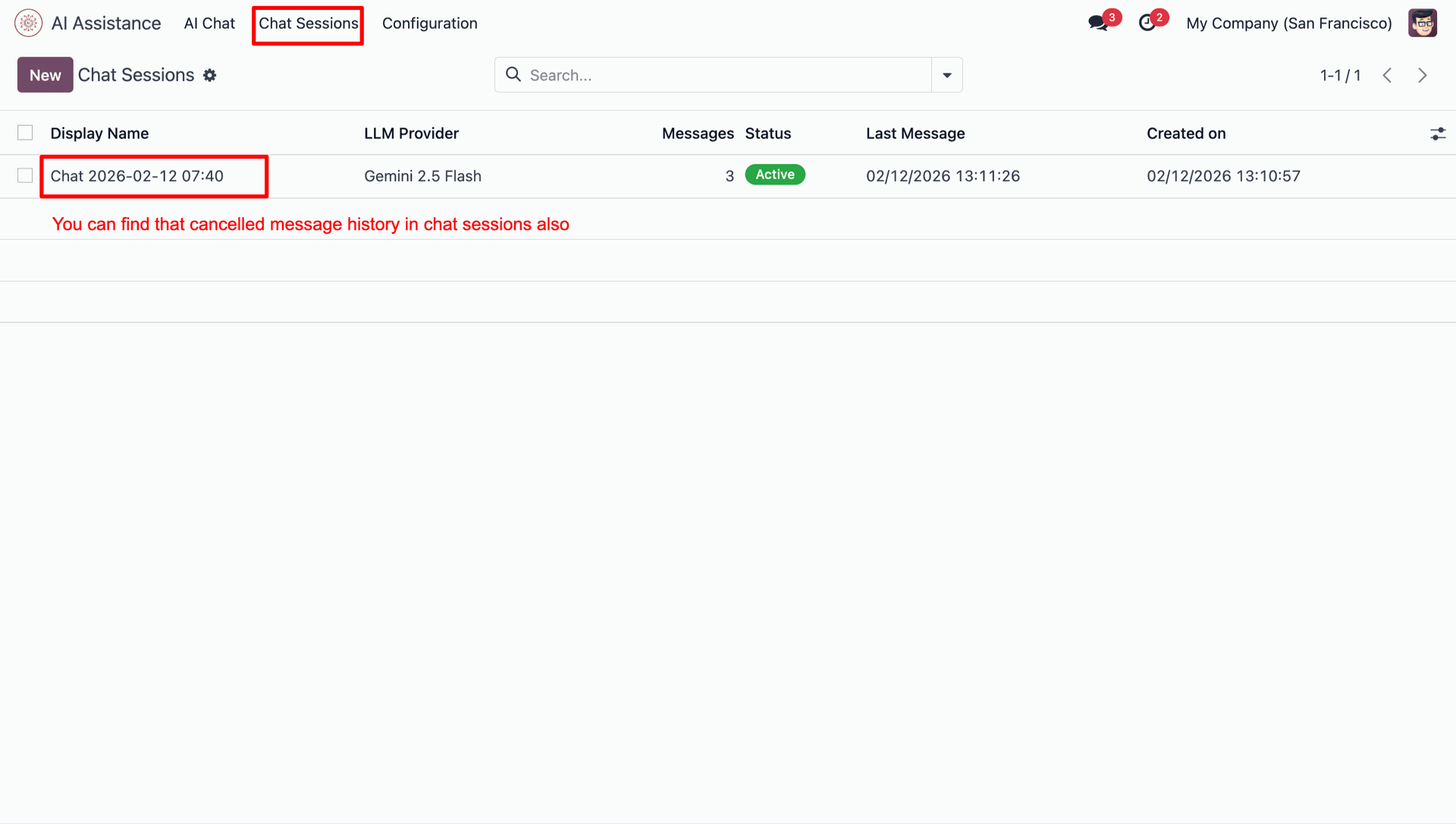 The Chat Session List View provides a centralized overview of all AI chat sessions in Odoo. Each record displays key details such as session name, selected AI model (LLM provider), message count, chat status, timestamps for the last message, and creation date.