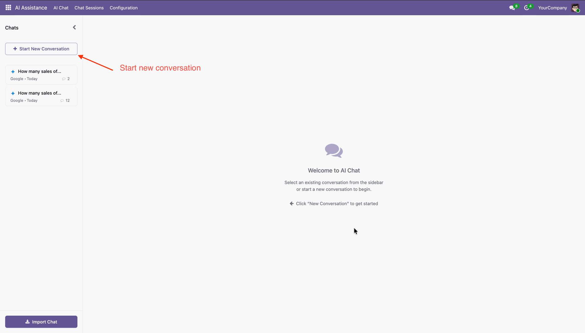 Offers a dedicated AI Chat menu for users to interact naturally with Odoo data. Automatically saves AI replies, user prompts, and provider details for audit and transparency. Maintains conversation continuity with session-based context and rename options. Option to delete chats for maintaining privacy and clearing old data.