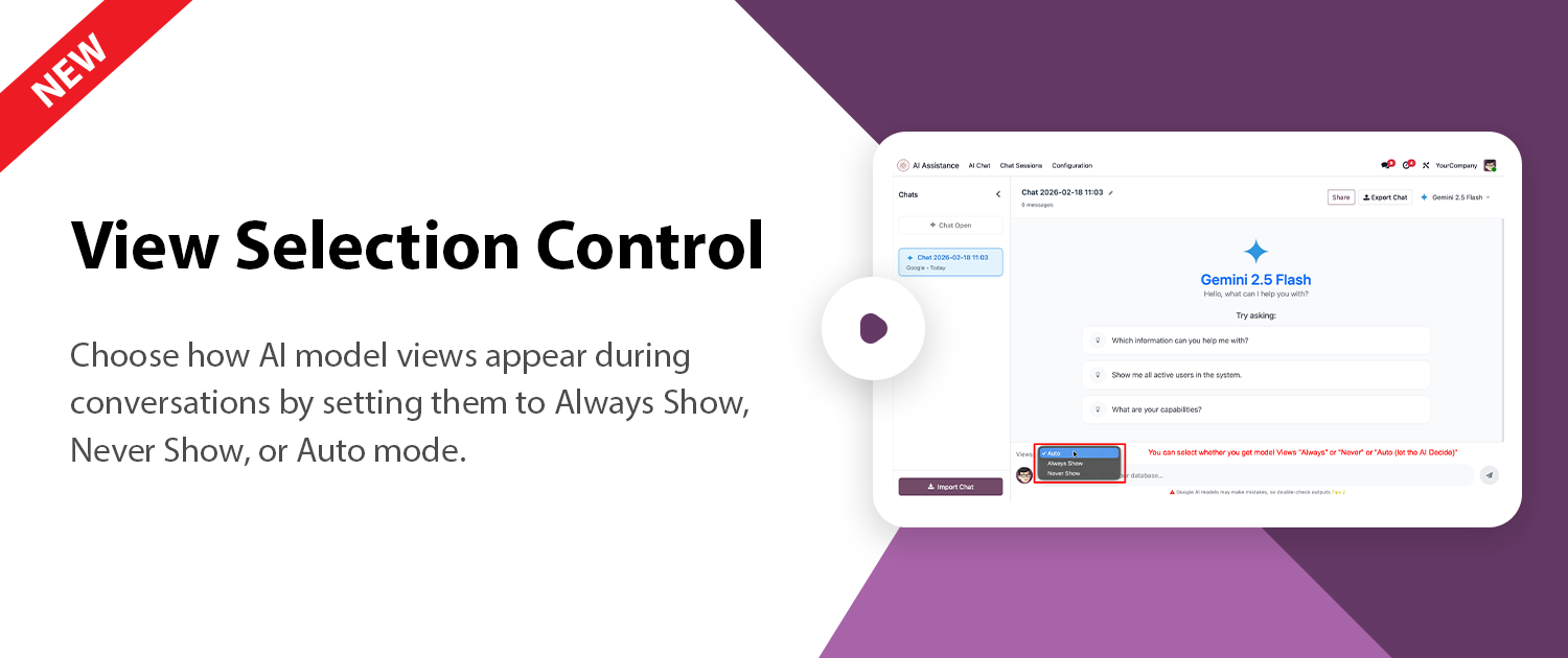 Control when AI model views appear with flexible options like Always, Never, or Auto for a smarter chat experience.