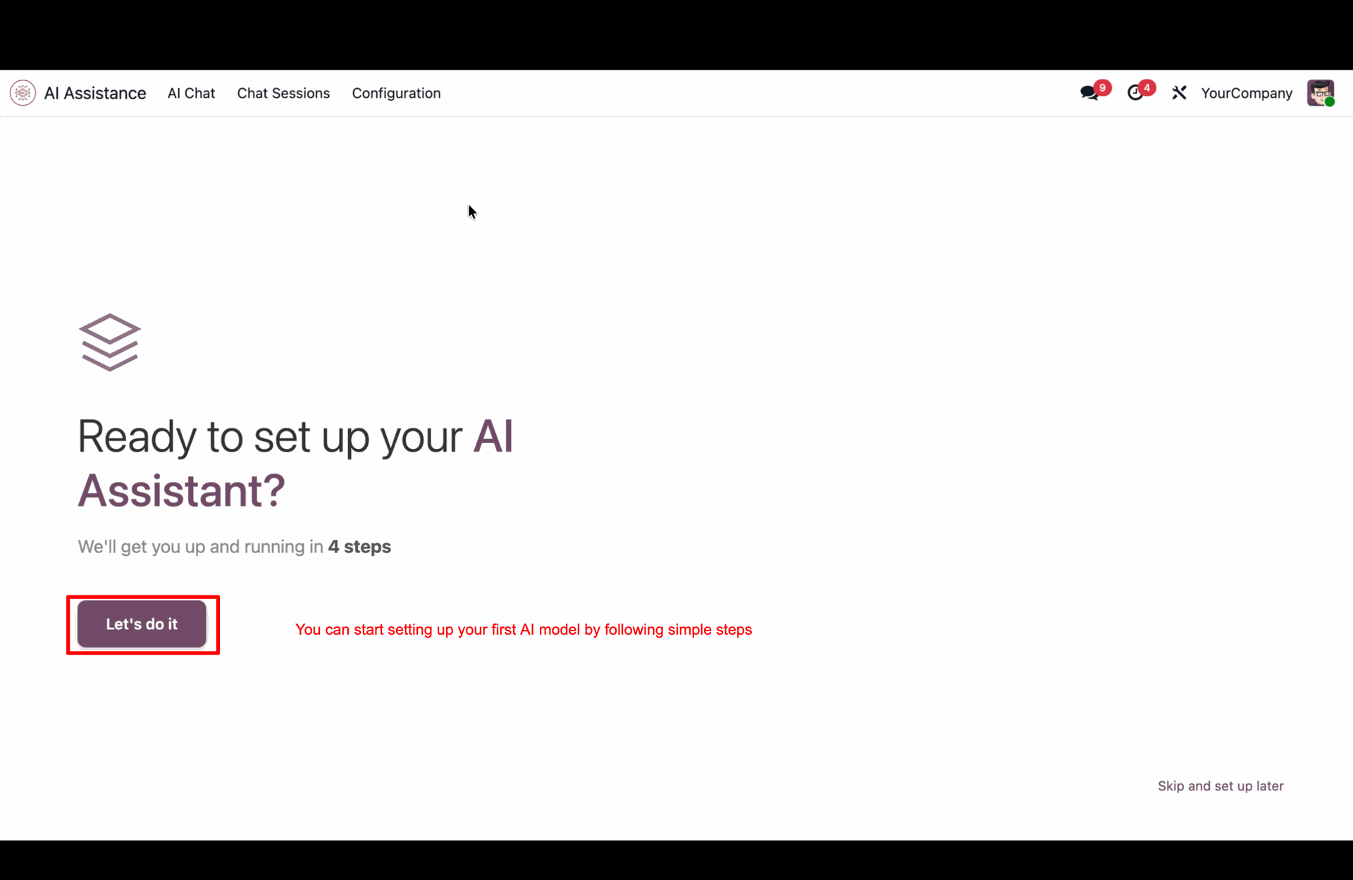 A guided onboarding flow that helps users quickly configure their first AI provider and model, ensuring a smooth setup.
