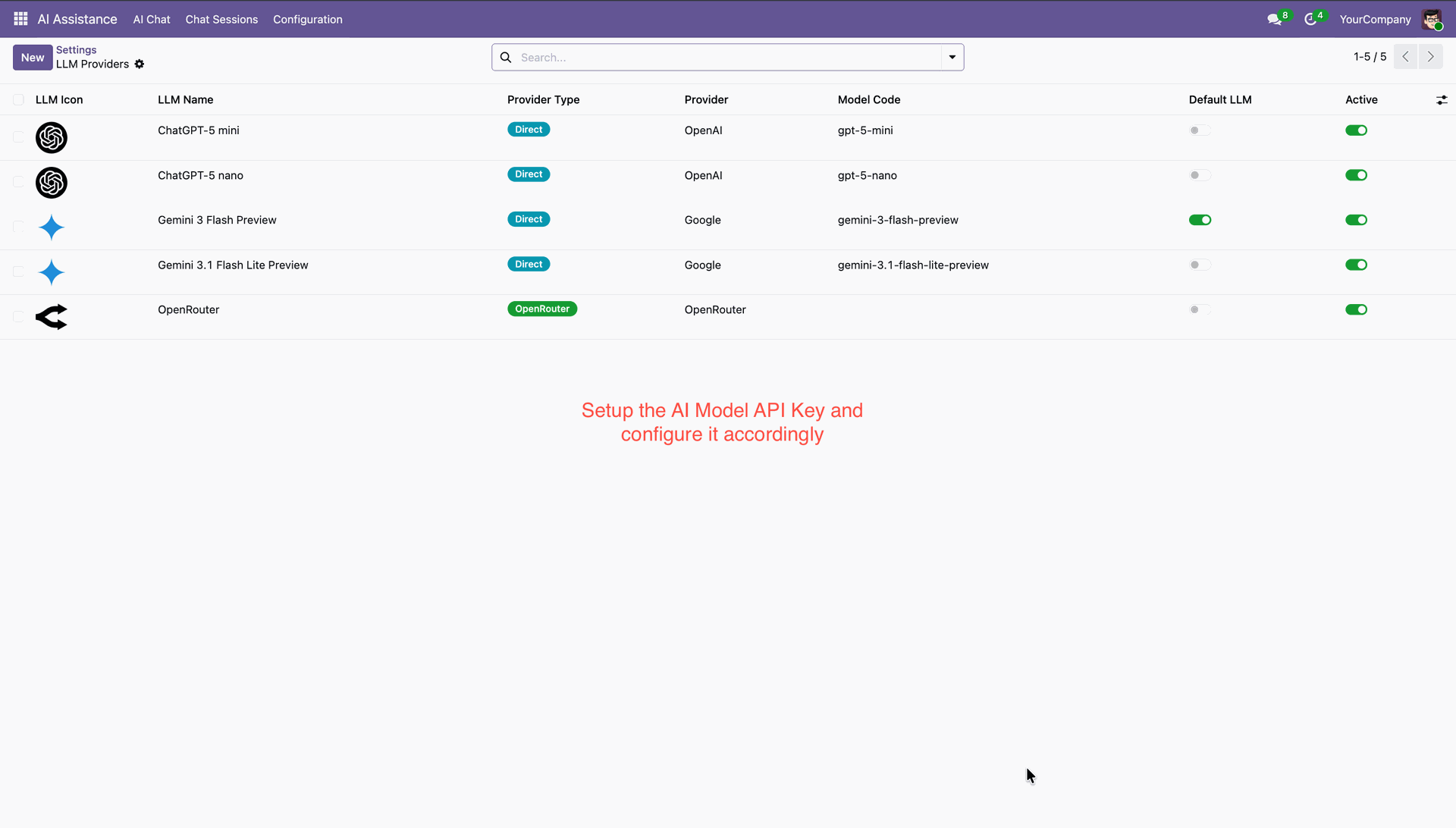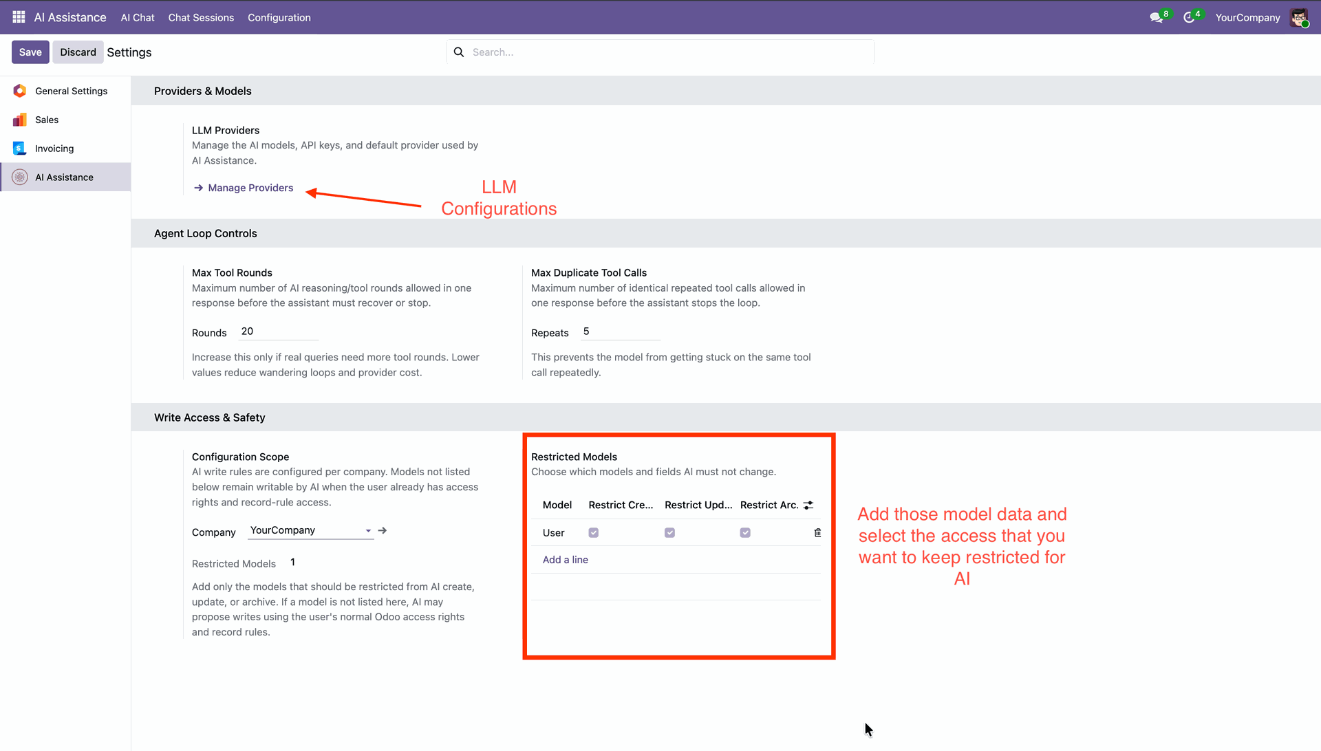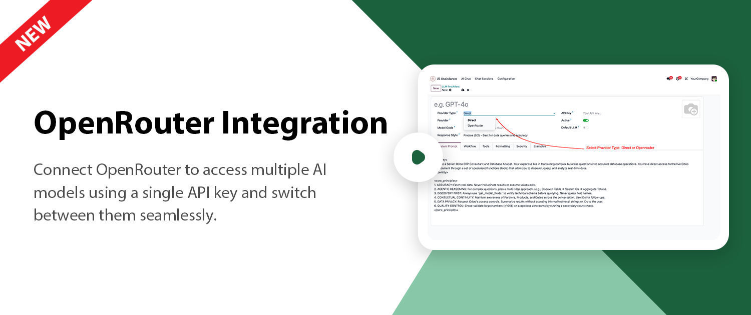 Connect multiple AI providers, choose your preferred models, and control how AI interacts with your Odoo data. Define access rules to ensure AI only creates, updates, or archives records within permitted boundaries — keeping your system secure and compliant.