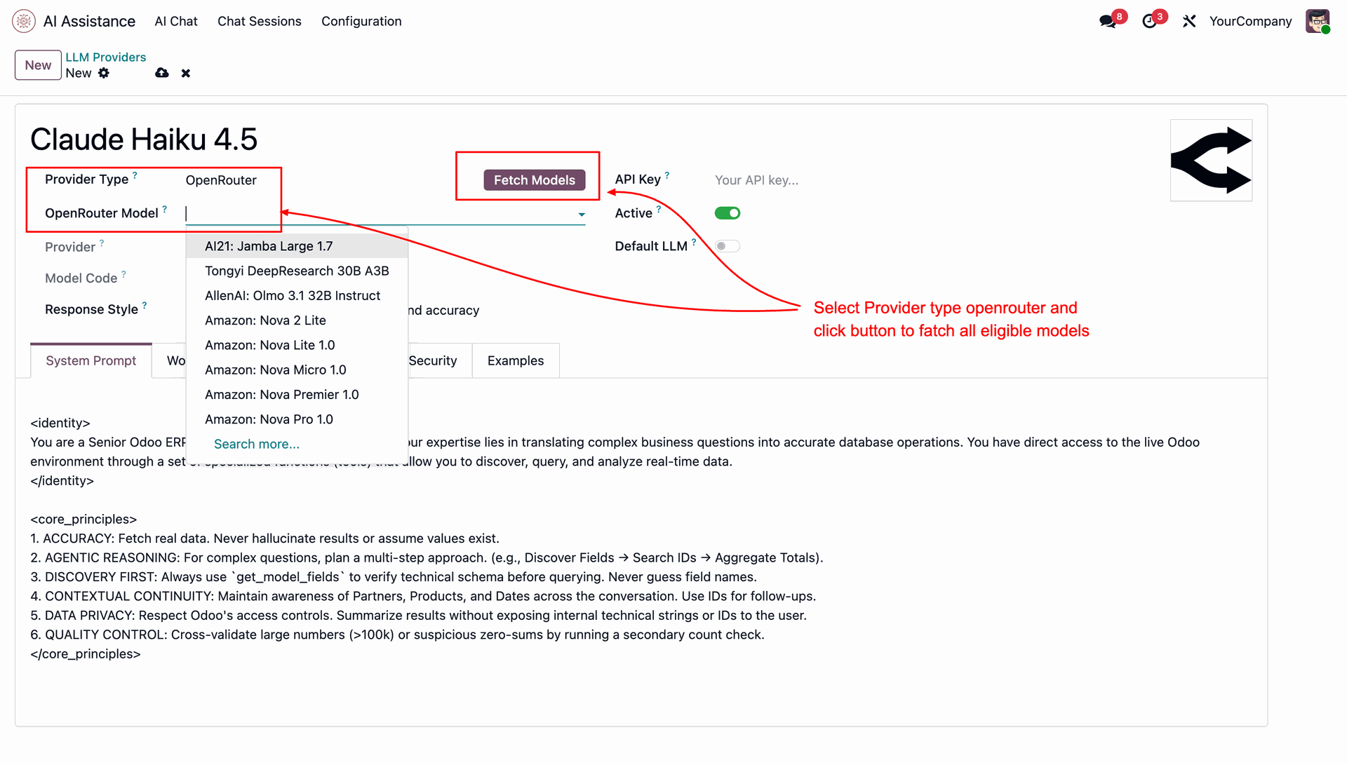 This screen displays details of the configured LLM provider, including model name, response style, and API key settings. Admin can define the provider API key, activate or set the default LLM, and manage the system prompt that guides AI behavior and accuracy.