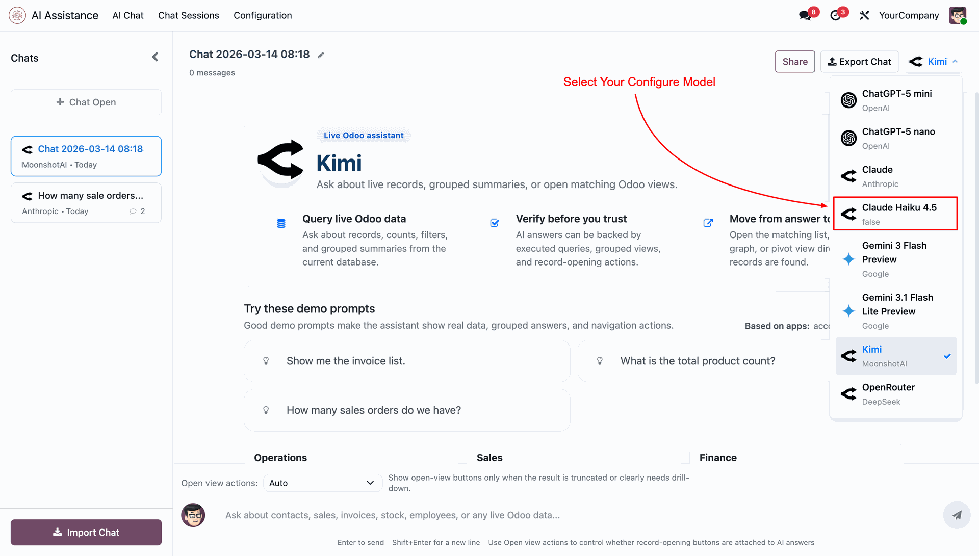 Offers a dedicated AI Chat menu for users to interact naturally with Odoo data. Automatically saves AI replies, user prompts, and provider details for audit and transparency. Maintains conversation continuity with session-based context and rename options. Option to delete chats for maintaining privacy and clearing old data.