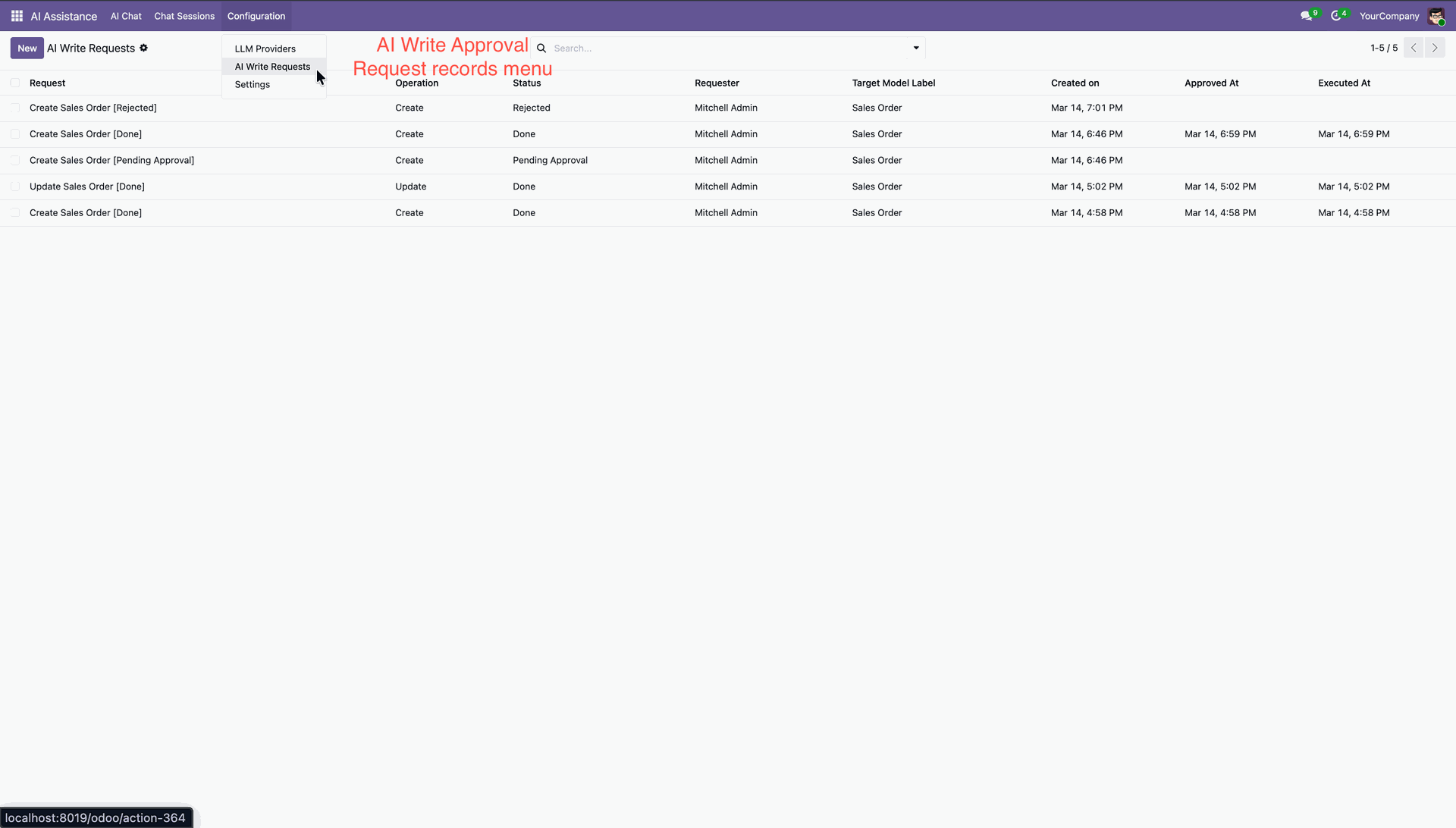 AI Write Request menu and list view.