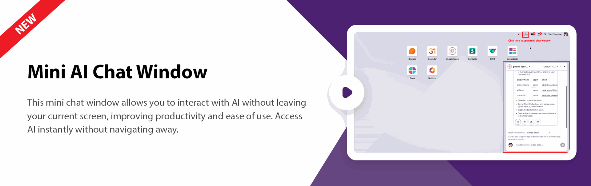 - A lightweight chatbot window accessible across all Odoo screens.