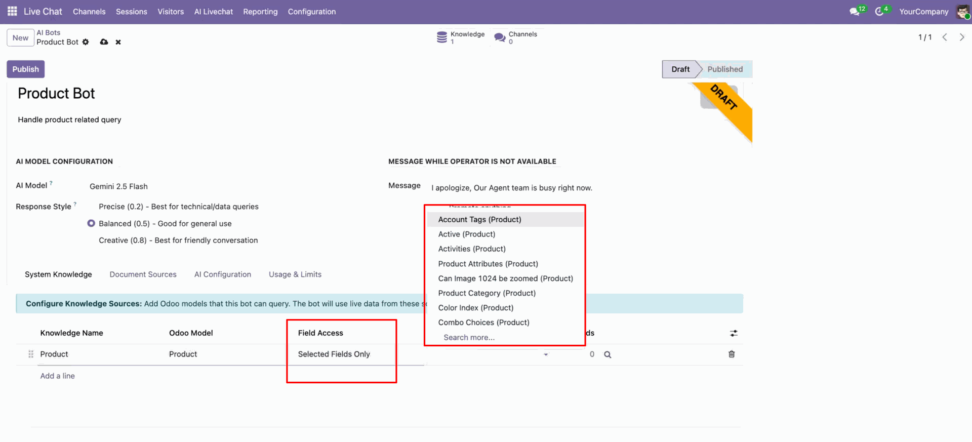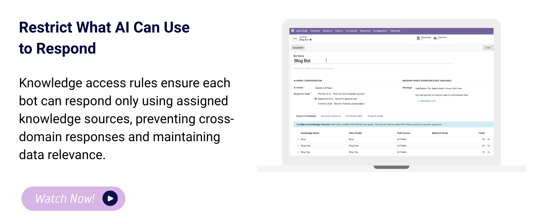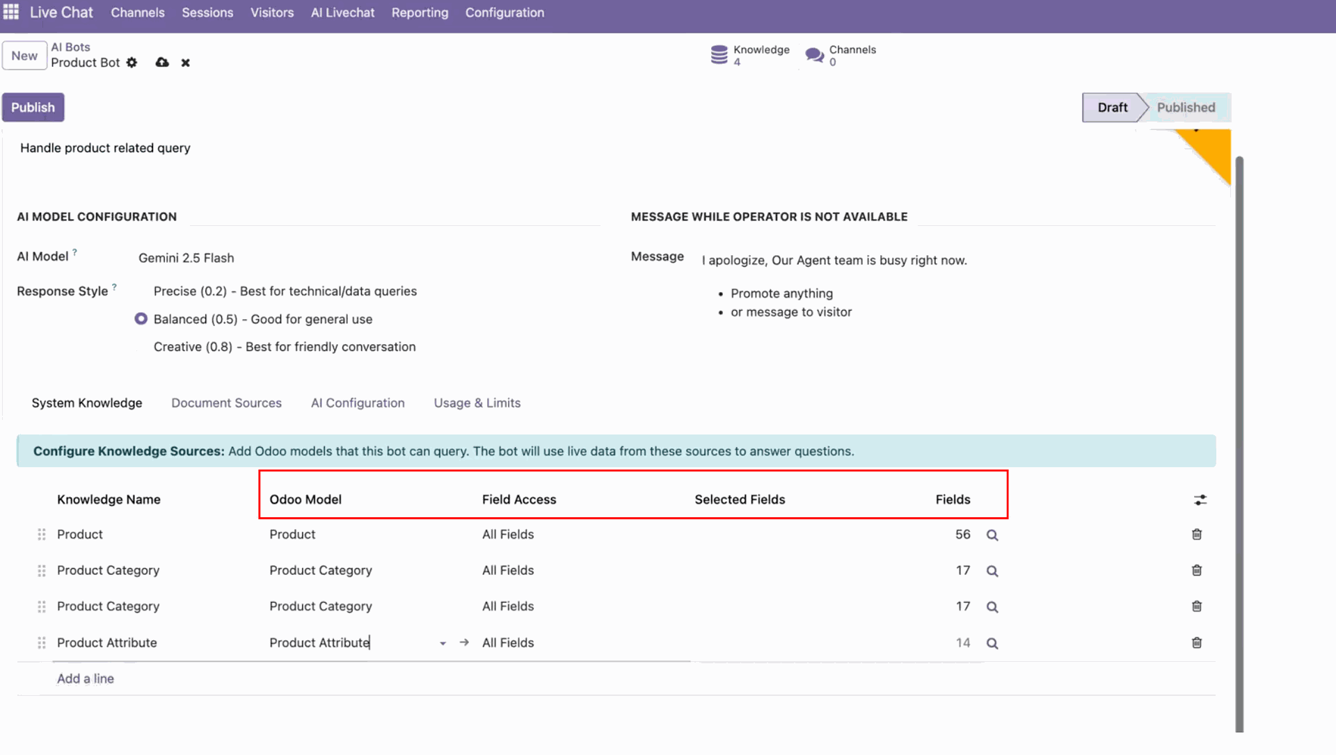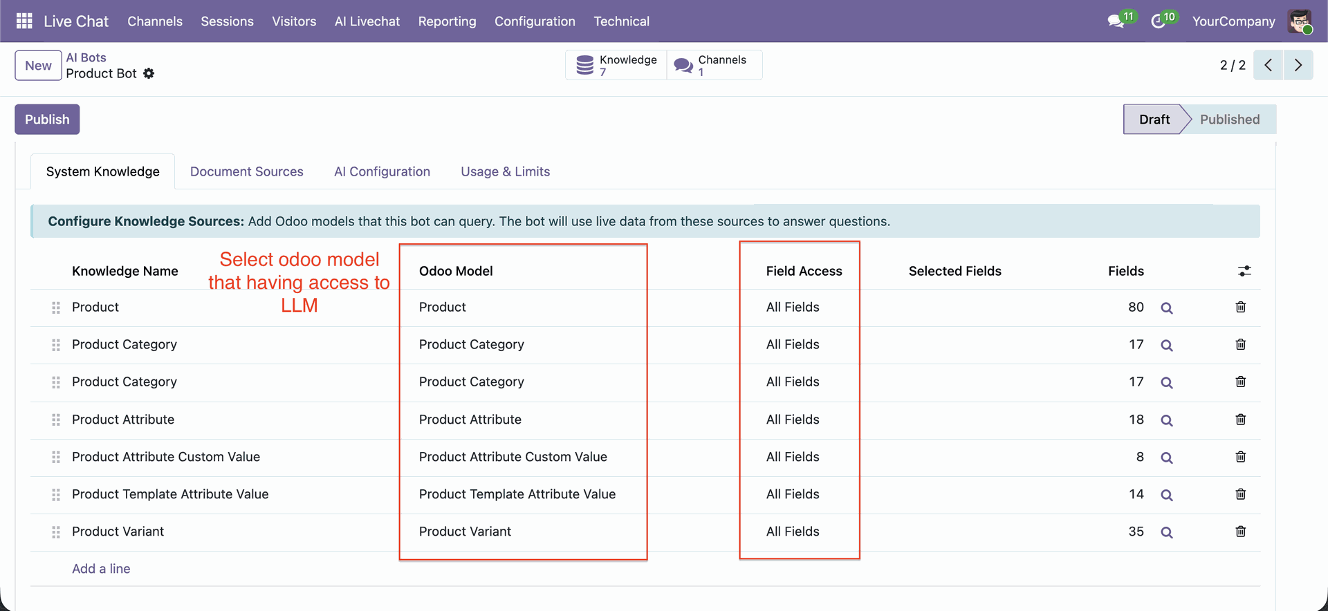 Configure Odoo models that the AI bot can access for answering live queries.