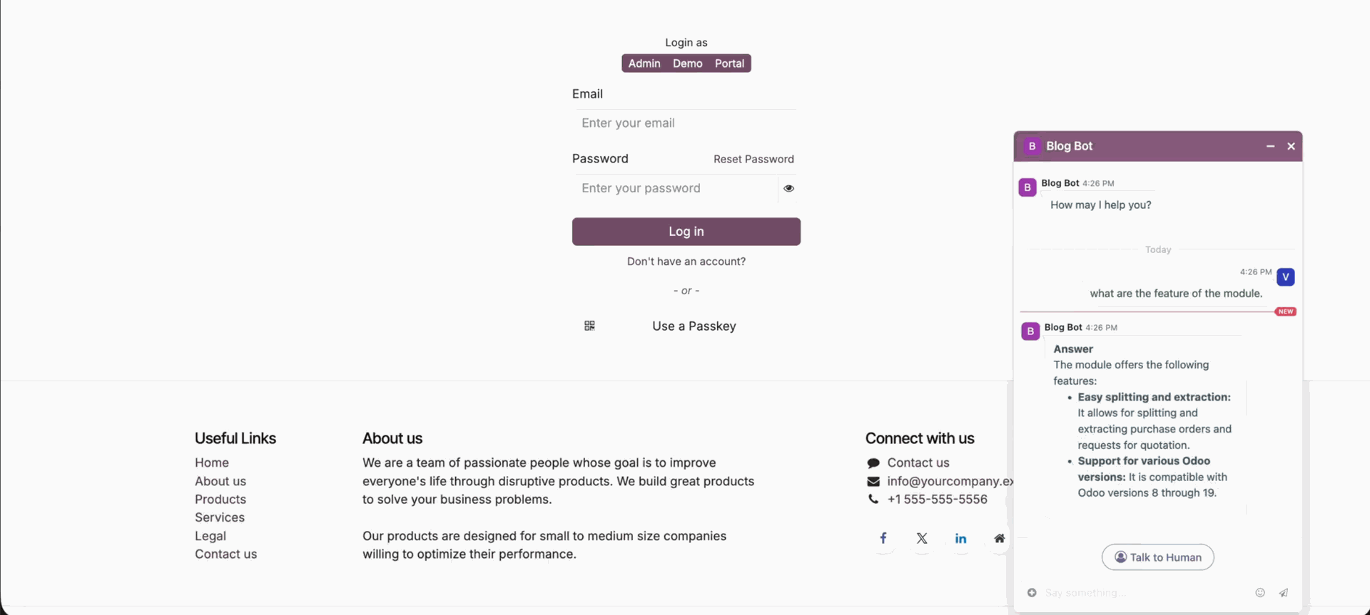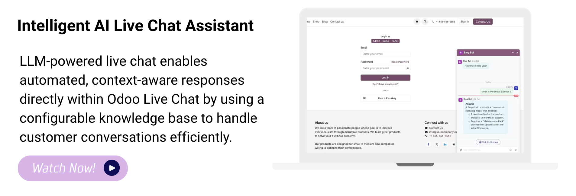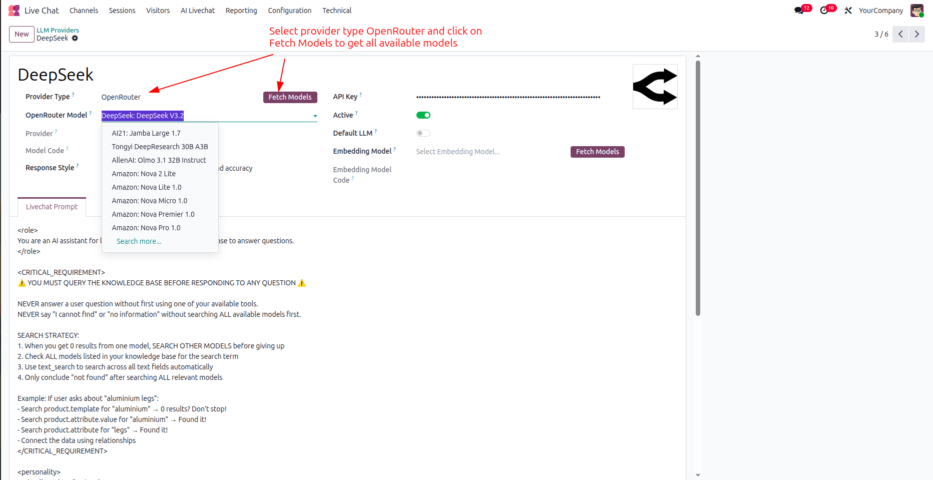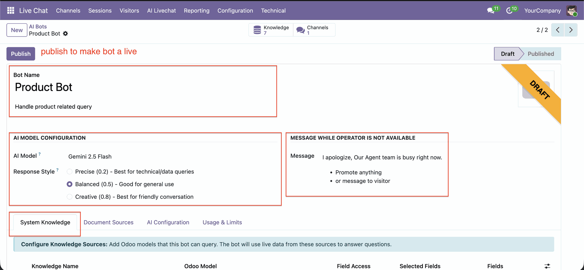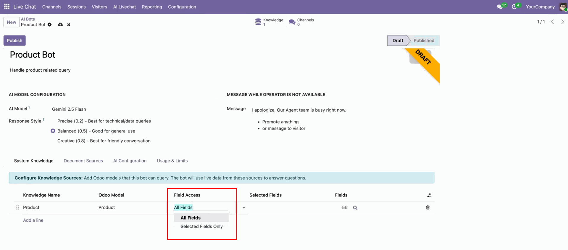 Configure Odoo models that the AI bot can access for answering live queries.