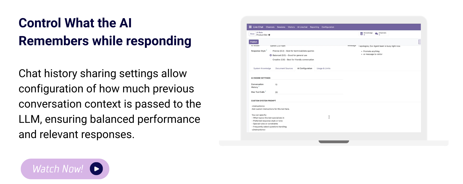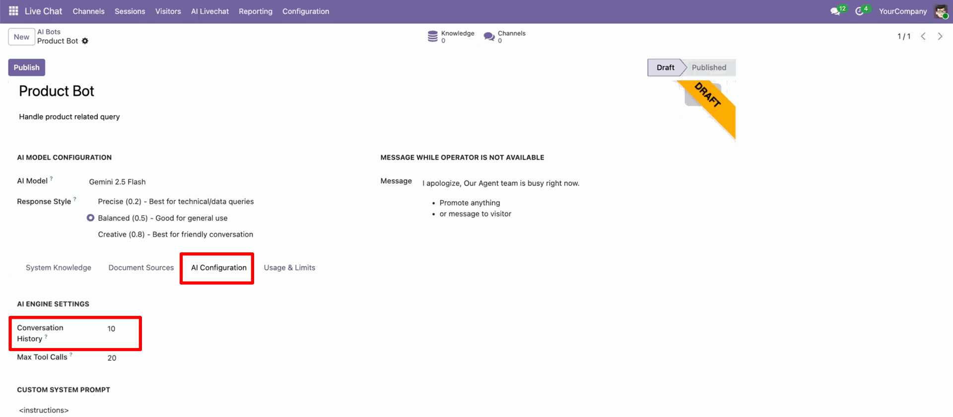 AI Configuration – Conversation History: Set how many past conversations (e.g., 10) the bot remembers to maintain context during a conversation.