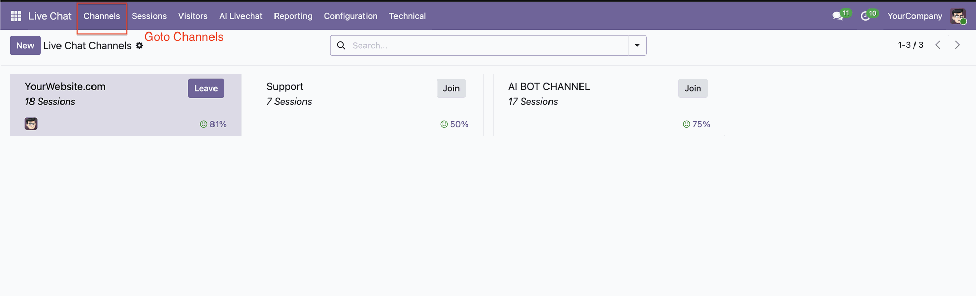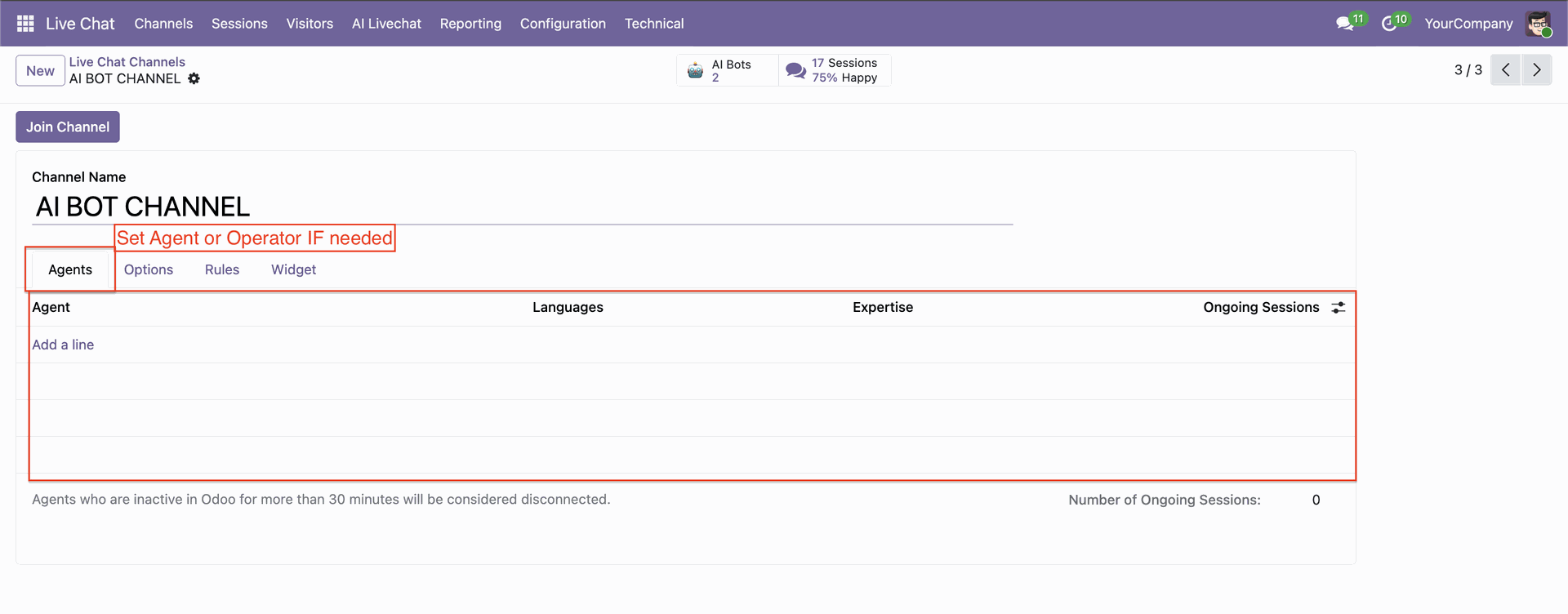 Navigate to live chat channels where AI bots can be assigned and activated.