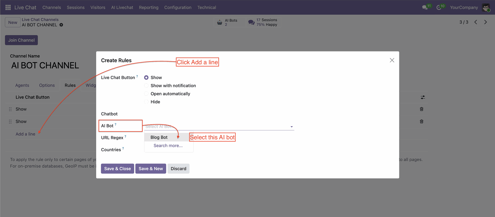 Click "Add a line" to set up Bot rules.