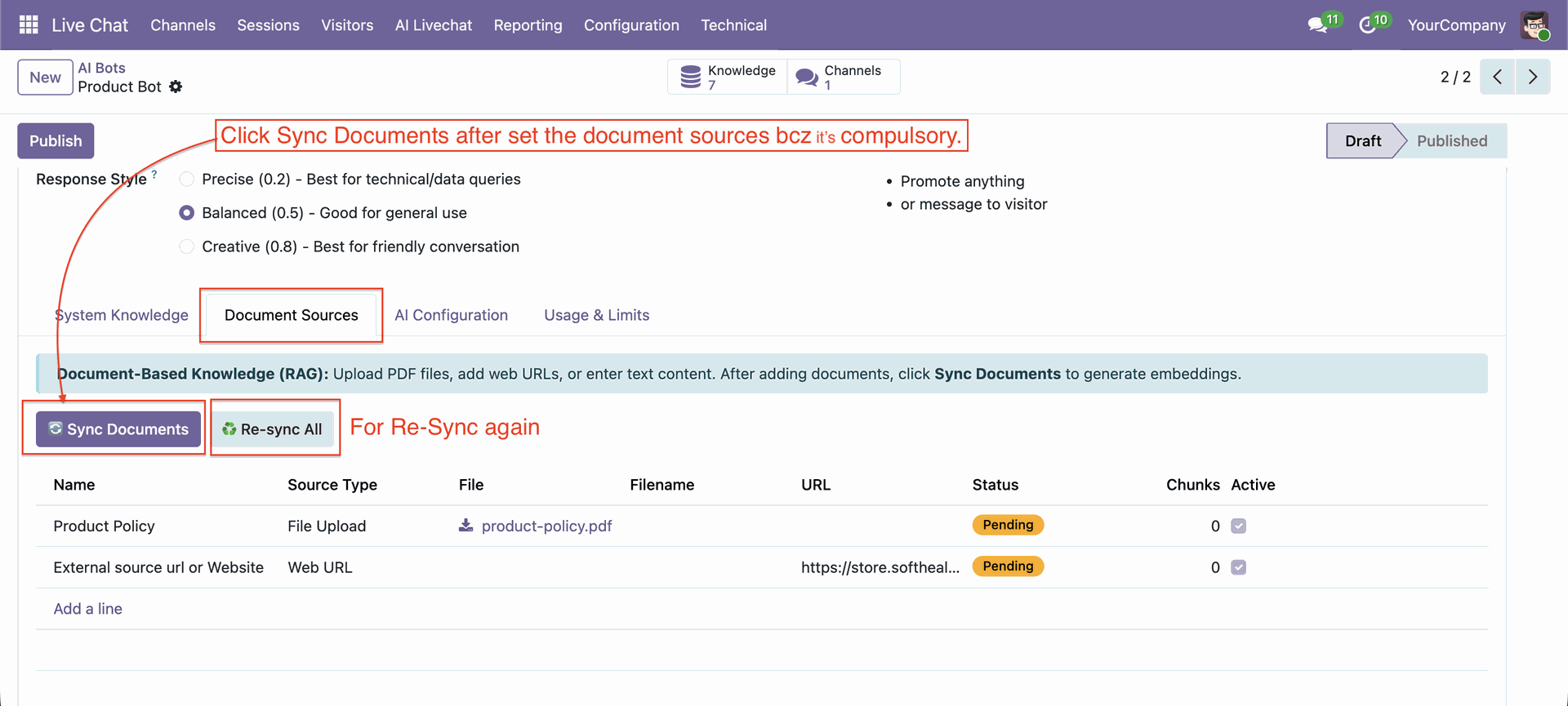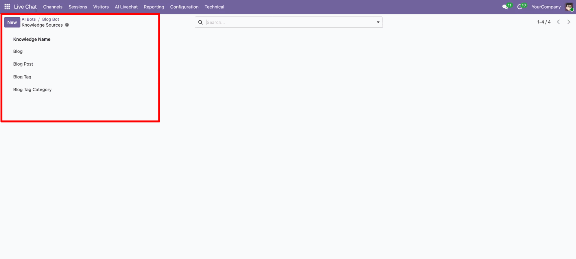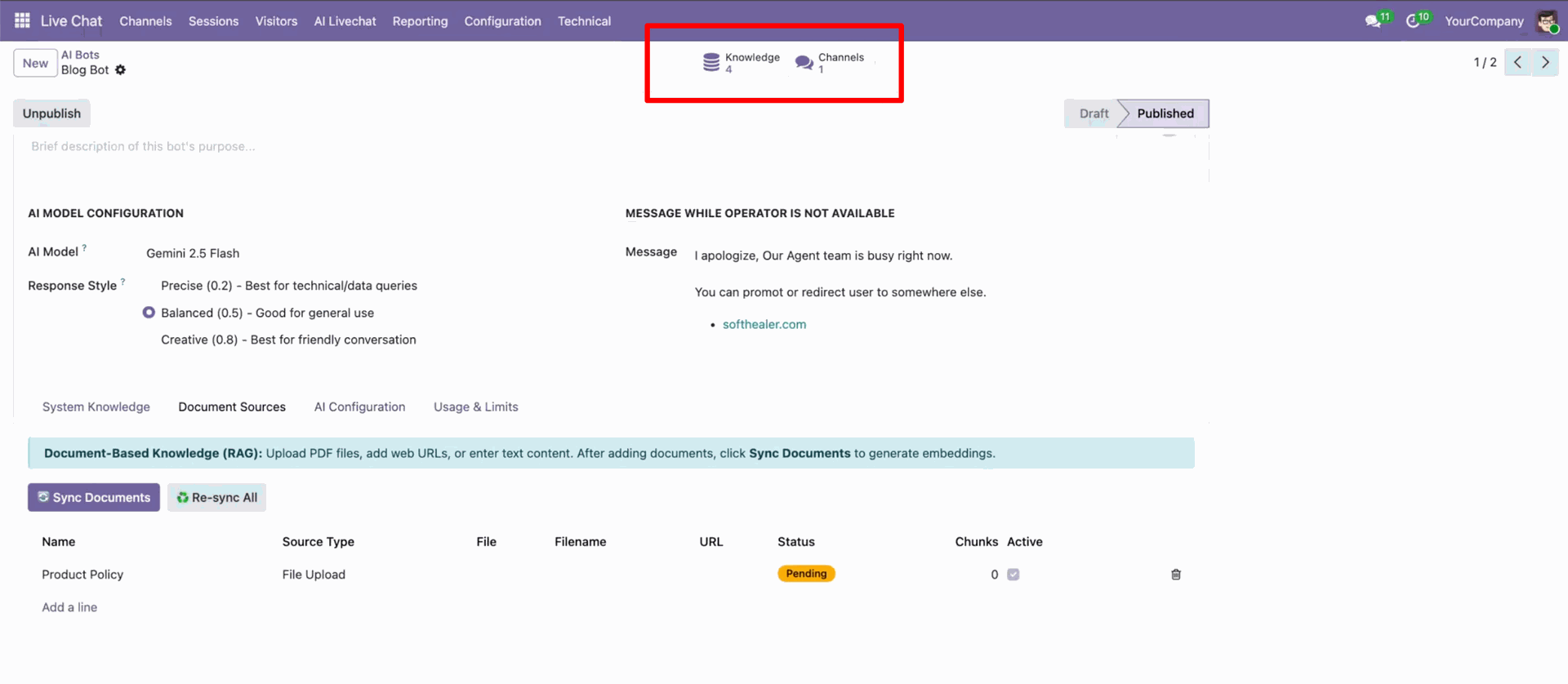 Go to the AI Live Chat -> Knowledge Sources.