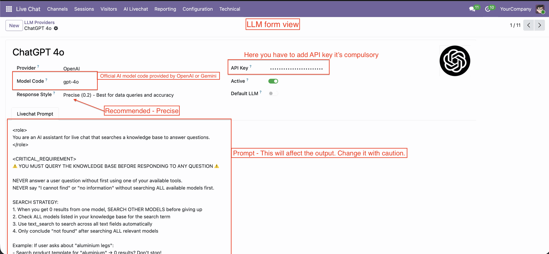 LLM form view, Configure necessary fields and prompts.