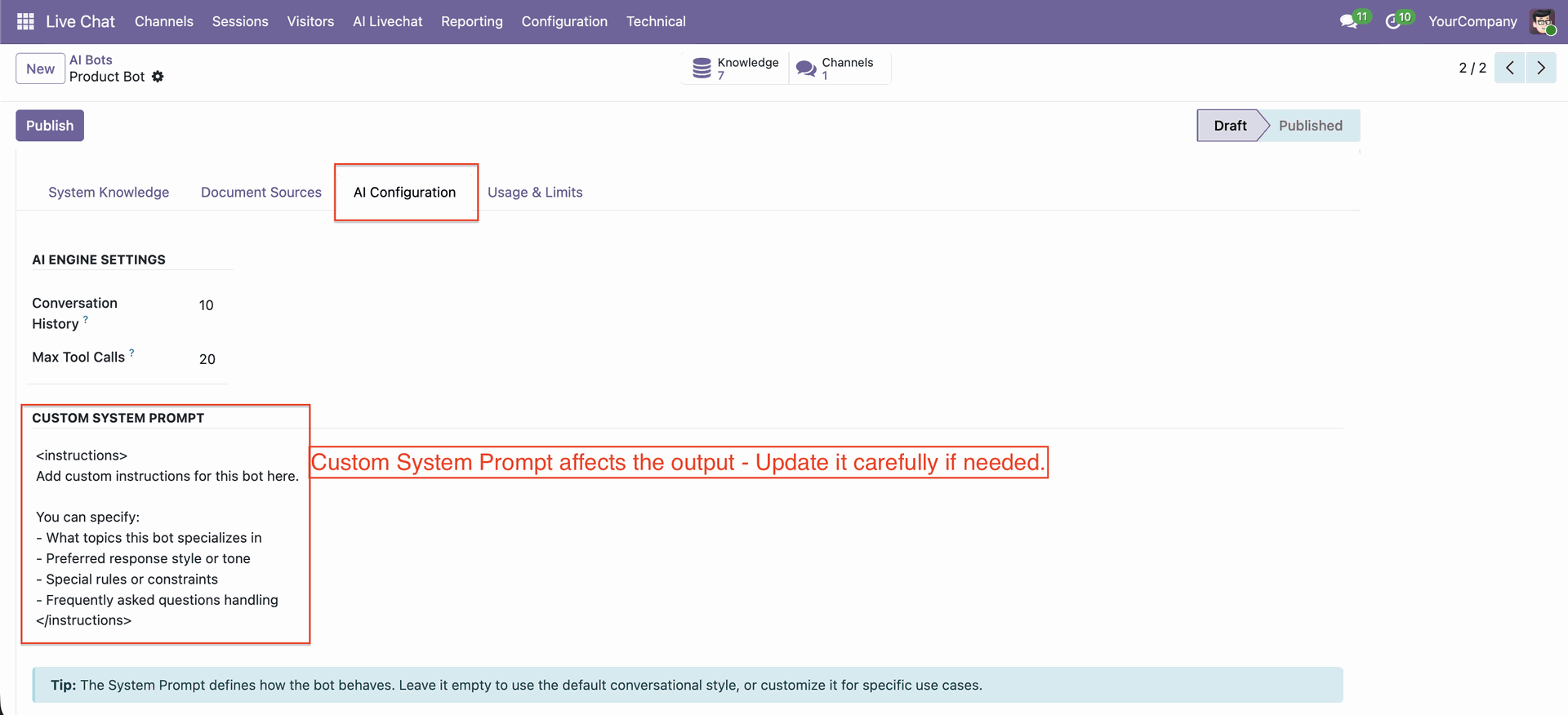In the AI bots, you can configure the system prompt.