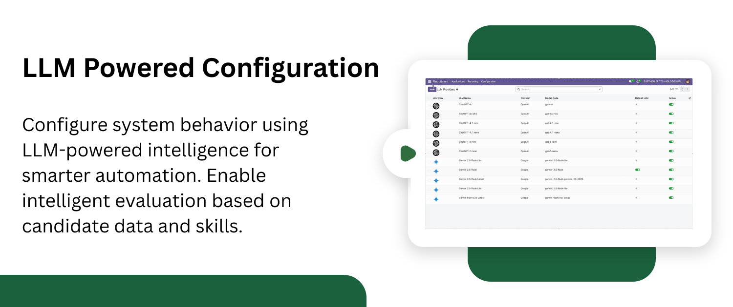 Automate recruitment processes in Odoo using AI-powered Resume/CV analysis and candidate matching. Configure LLM providers and define prompts to analyze applicant resumes, extract key information such as skills, experience, and summary, and digitize Resume/CV data directly into structured format. Compare applicant profiles with job position requirements by setting expected skills and enabling AI-based matching. The system automatically evaluates candidates and provides matching insights, helping recruiters make faster and smarter hiring decisions.