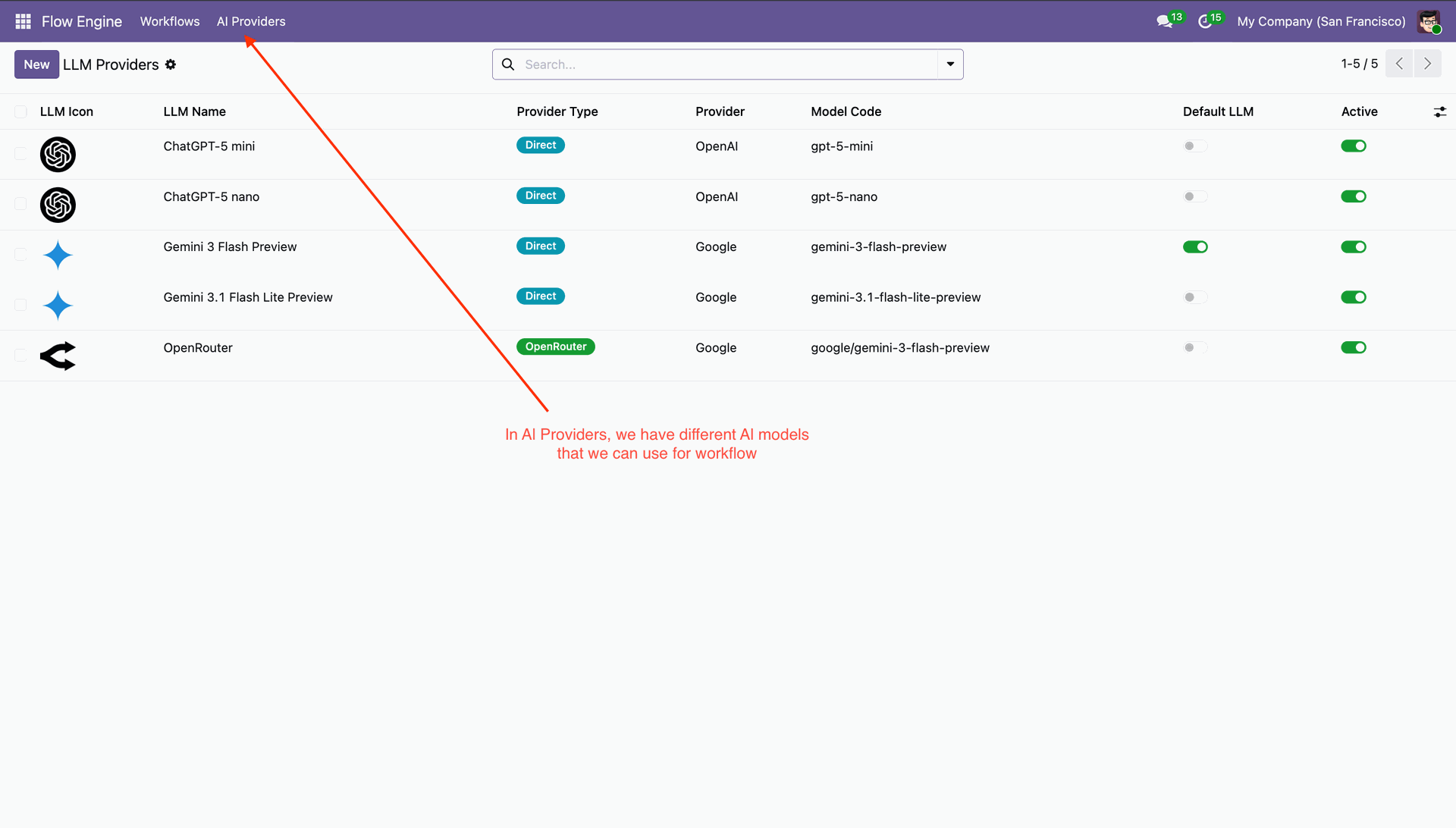 AI providers list view that we can use for the workflow.