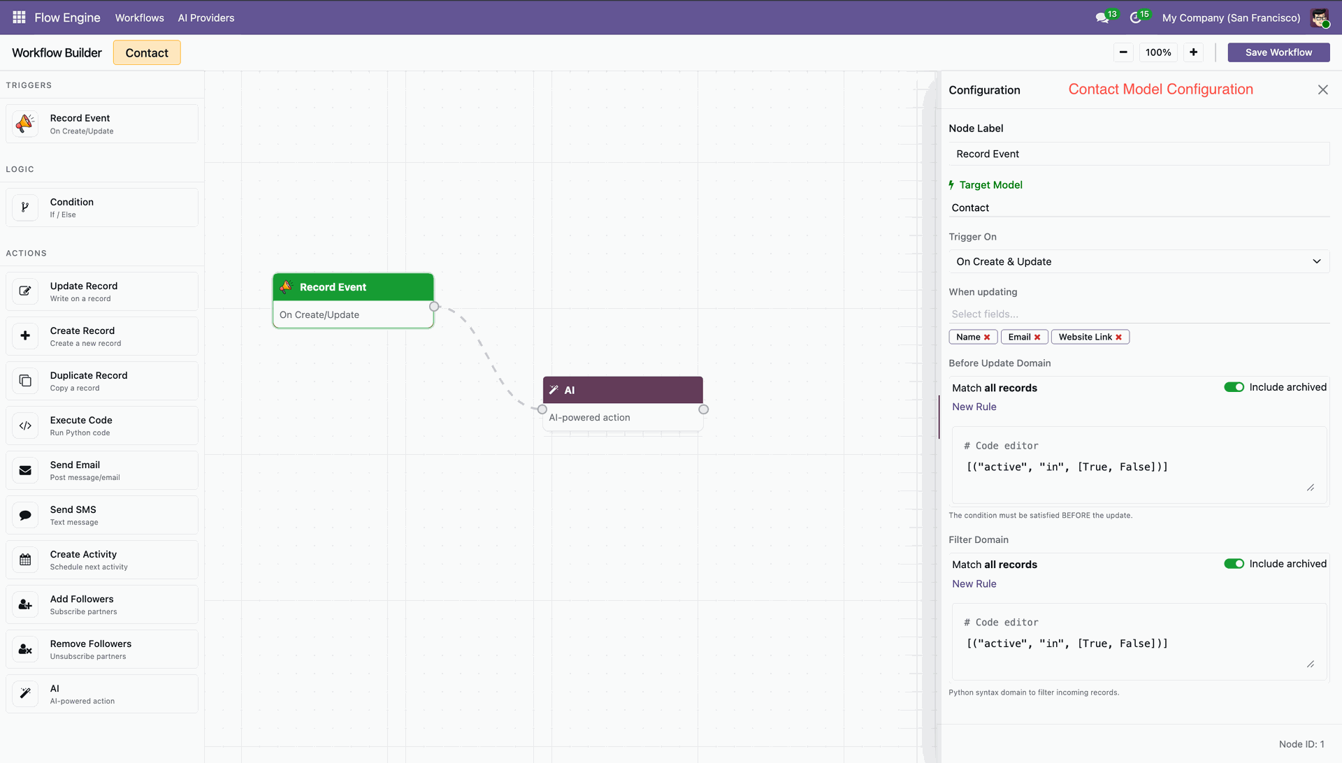 Create workflows using connected nodes to visually define the sequence of conditions and actions.
