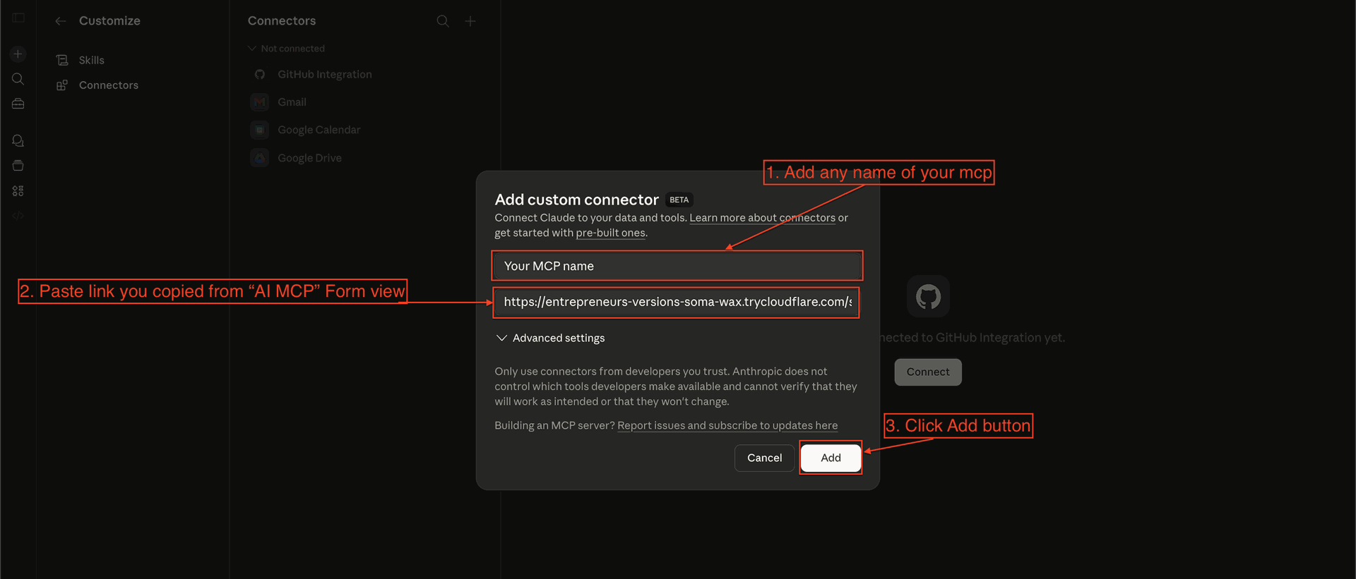 Add the MCP name, URL, and click 'Add'.